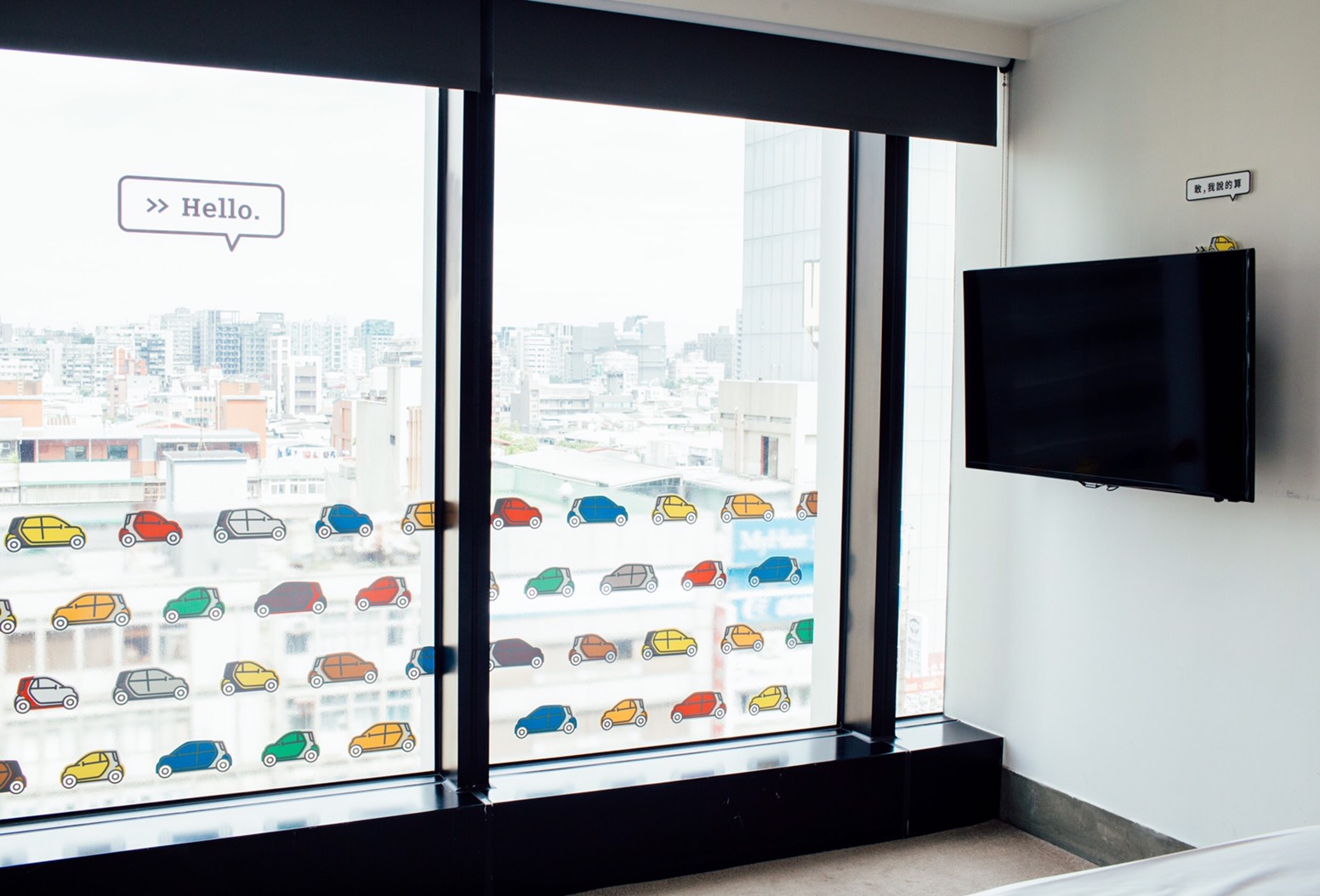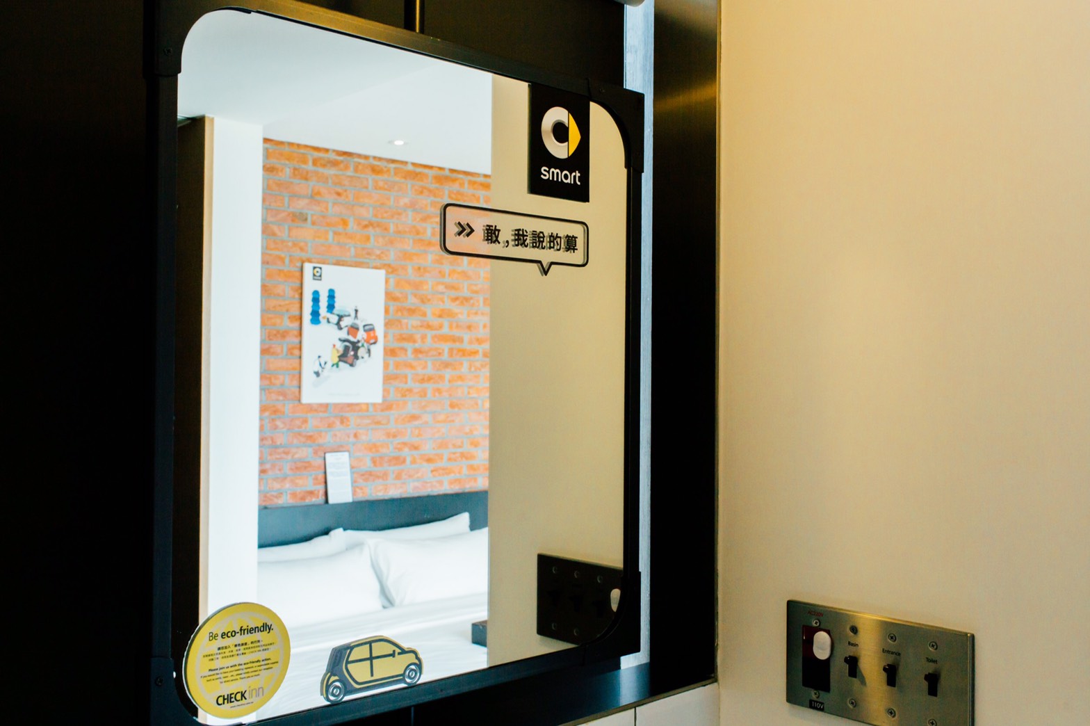 客房入口處的特製全身鏡,彷彿置身於 smart 駕駛座,讓你用第一視角享受錯位拍照的樂趣。