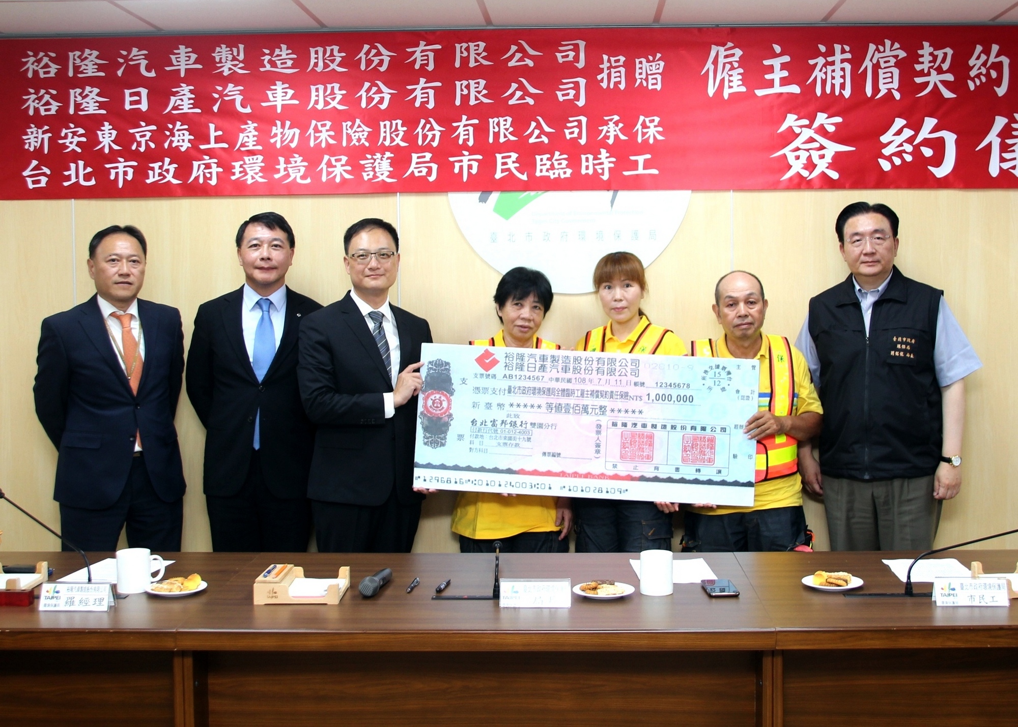 裕隆日產汽車今年持續與裕隆汽車共同捐贈新台幣100萬元,為台北市政府環保局市民臨時工投保「僱主補償契約責任險」,以實際行動感謝這群無名英雄的辛勞與付出,今(11)日由台北市環保局劉銘龍局長代表受贈,透過這份關懷與心意,讓辛勤維護市容整潔的市民臨時工擁有多一重安心保障,在不幸遭逢意外與急難時,能夠立即獲得實質資助,減輕家庭經濟重擔。