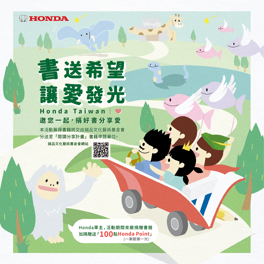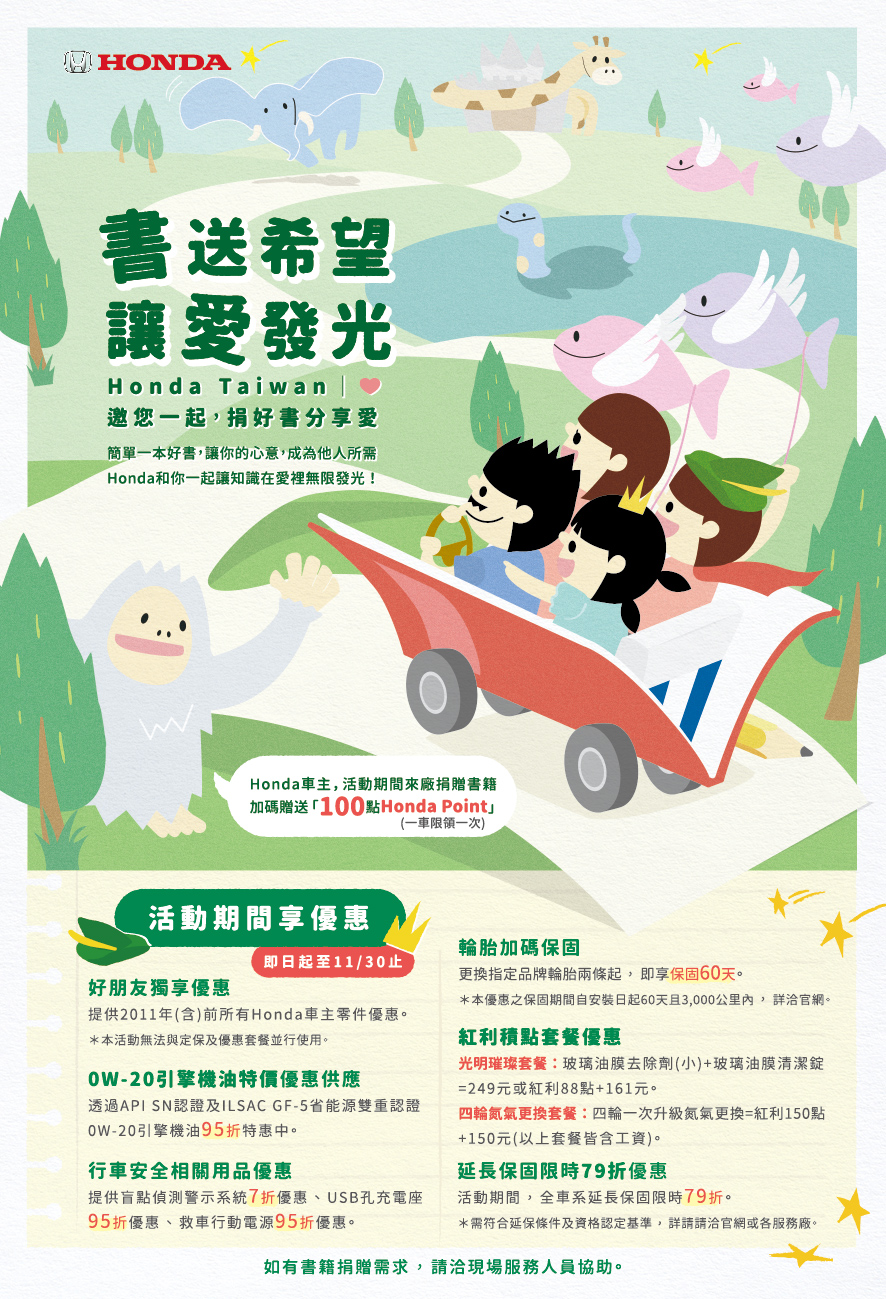Honda Taiwan車主於即日起至2019年11月30日止來廠參與捐贈書籍活動,更加碼贈送「100點Honda Point」。