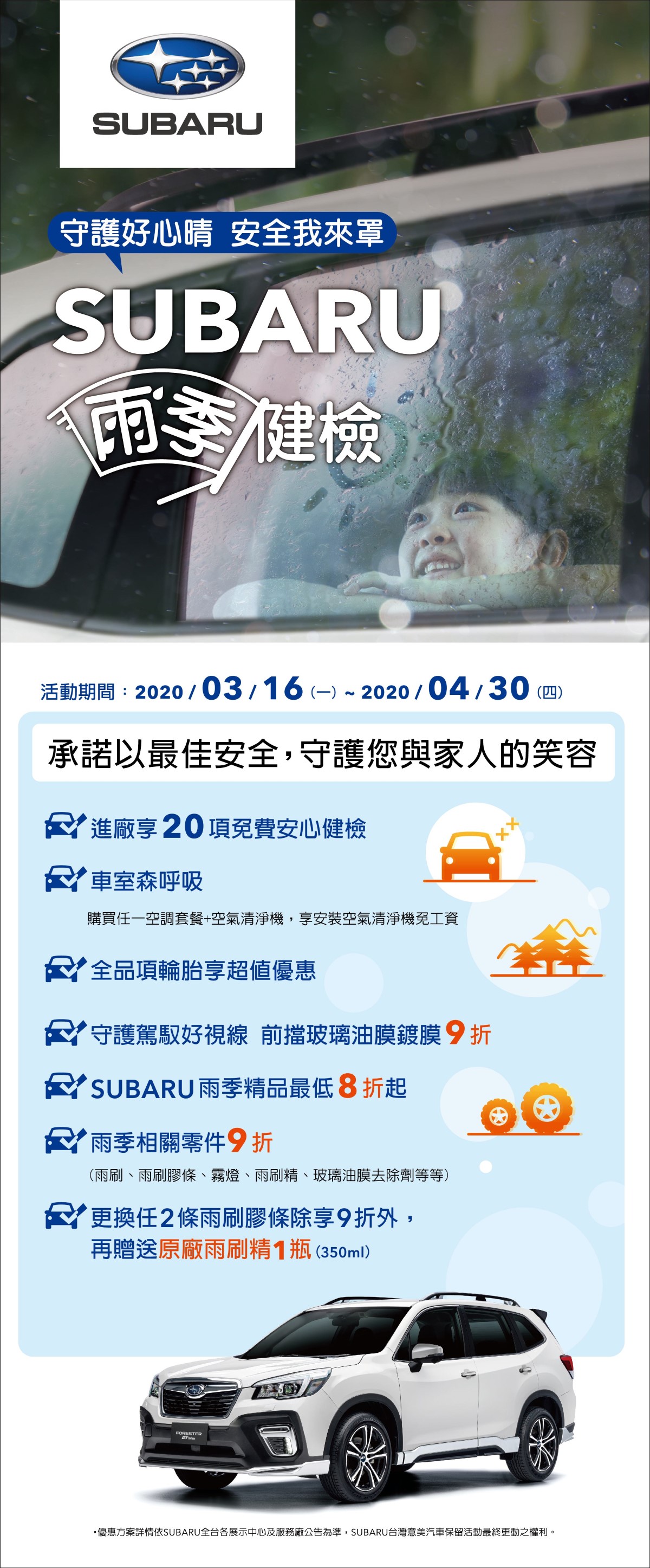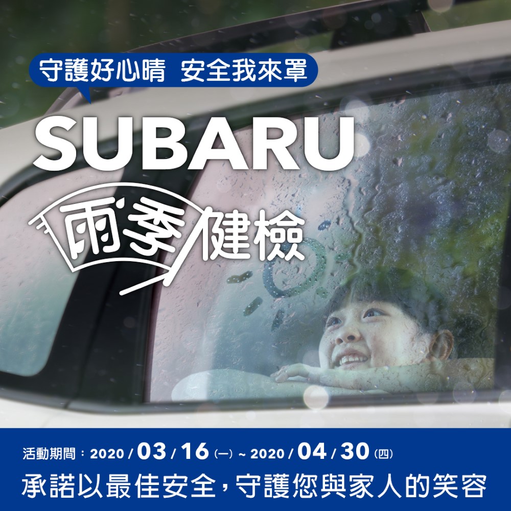 時至清明連續假期,Subaru因應伴隨而來的雨季,於2020年3月16日(一)起至4月30日(四)止,提供車主「Subaru雨季健檢」服務,針對愛車進行20項免費檢查,並推出相關零件、原廠精品和前擋玻璃油膜鍍膜車主專屬優惠,承諾用心守護每一位用車人的行車安全,體現Subaru信賴駕馭的品牌精神。