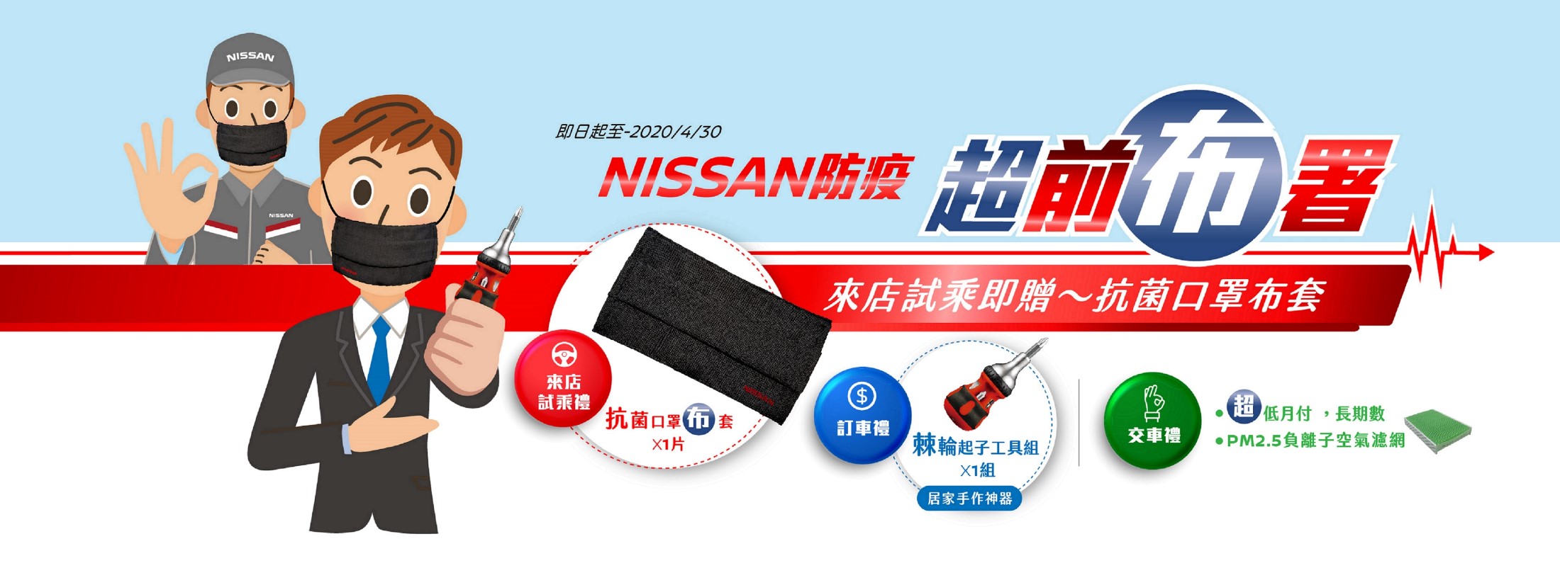 「Nissan防疫超前布署」專案優惠(超低月付暨長期數專案、訂車禮及交車禮)僅限於活動期間2020/4/1~2020/4/30,下訂NISSAN國產全車系之新車並完成領牌程序者。公司法人、大宗批(標)售、租賃車、營業車、370Z、GT-R、Juke、Leaf及Altima等不適用之。