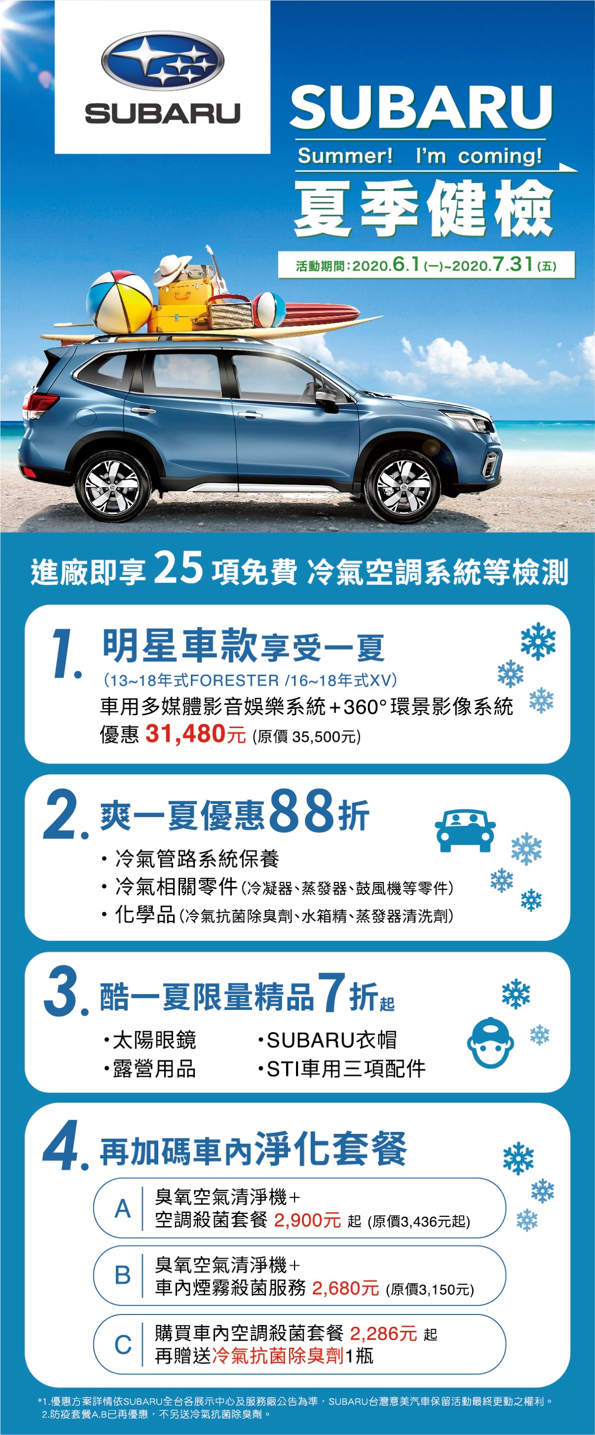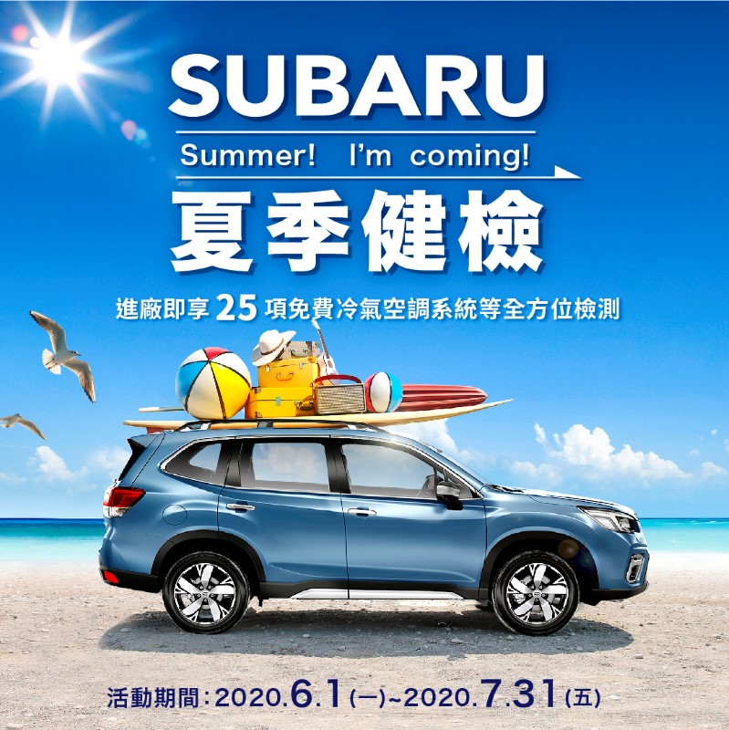 Subaru台灣意美汽車誠摯敬邀所有Subaru車主,即刻提前來電預約回廠參加「2020 SUBARU夏季健檢」活動,有關更多詳細活動內容,歡迎至台灣意美汽車官方網站: https://www.subaru.asia/tw/zh/promotions/#promotion-tab3查詢,或撥打Subaru客戶服務專線0800-486-168,洽詢相關活動內容。