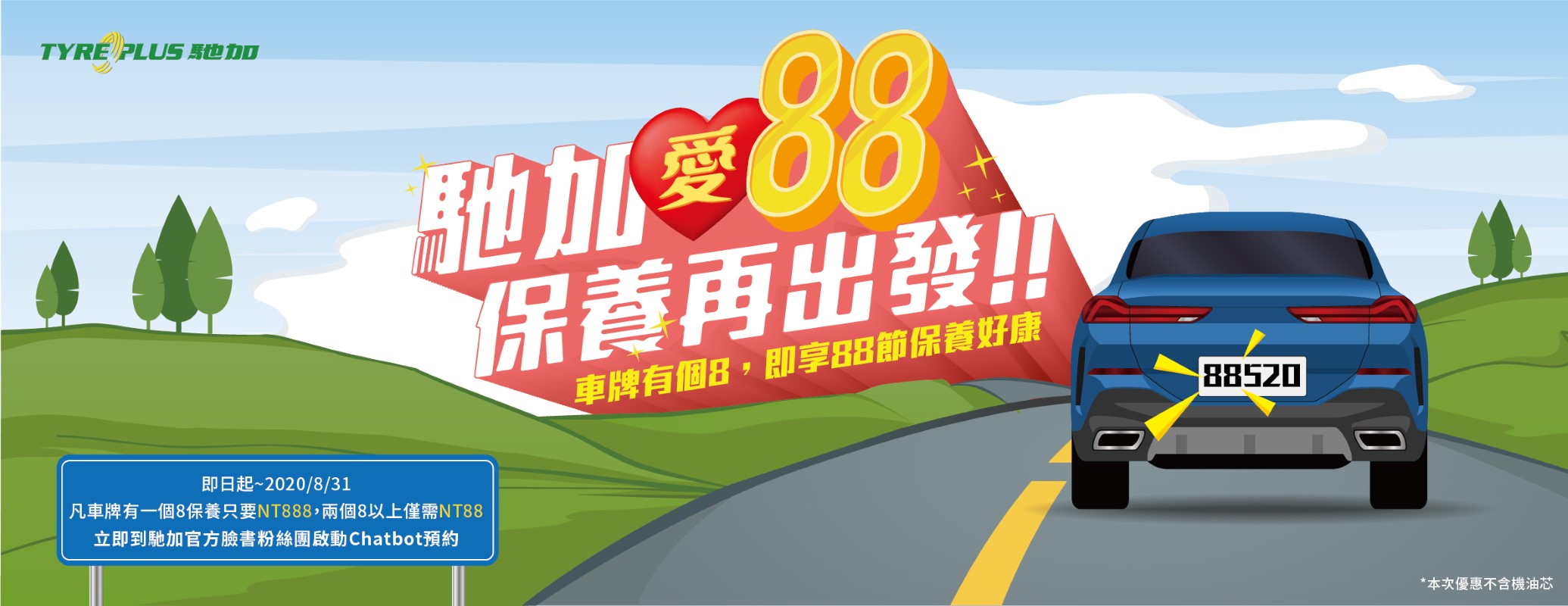 即日起至8月31日,凡是轎車車牌中有數字8,就有機會至全台馳加加盟店,享有馳加牌全合成機油保養優惠價(不含機油芯)。車牌含有一個8,愛車保養只需888元;若您的車牌有兩個8,即享超優惠價88元。在這樣一個熱情奔放的季節,你我都值得一段美好的夏日出遊回憶,您旅程的最佳拍檔更值得最細緻的照顧。「馳加汽車服務中心」將提供最溫暖的服務,讓愛車陪伴您快樂出遊、安全回家。踏上全新的旅程前,保養再出發,給自己和家人一個安全的乘車環境。「馳加汽車服務中心」關心您與家人的乘車安全。