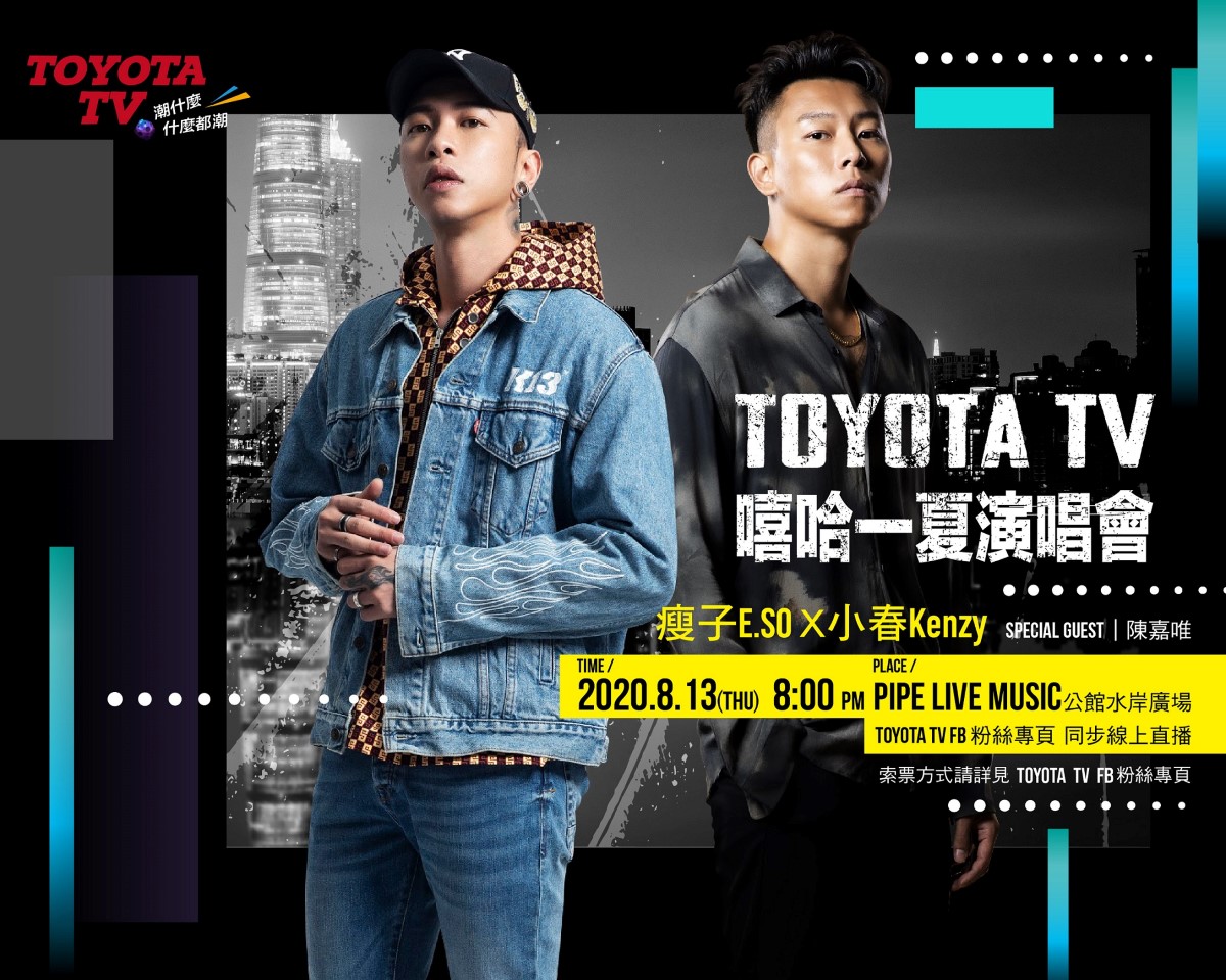為了回饋觀眾與粉絲的支持,Toyota攜手金曲嘻哈團體《頑童MJ116》成員瘦子E.SO與小春Kenzy,共同舉辦首場《TOYOTA TV嘻哈一夏演唱會》,即將在8/13於台北PIPE Live Music演出,並同步於TOYOTA TV 線上直播,帶給粉絲們最潮的嘻哈饒舌魅力!