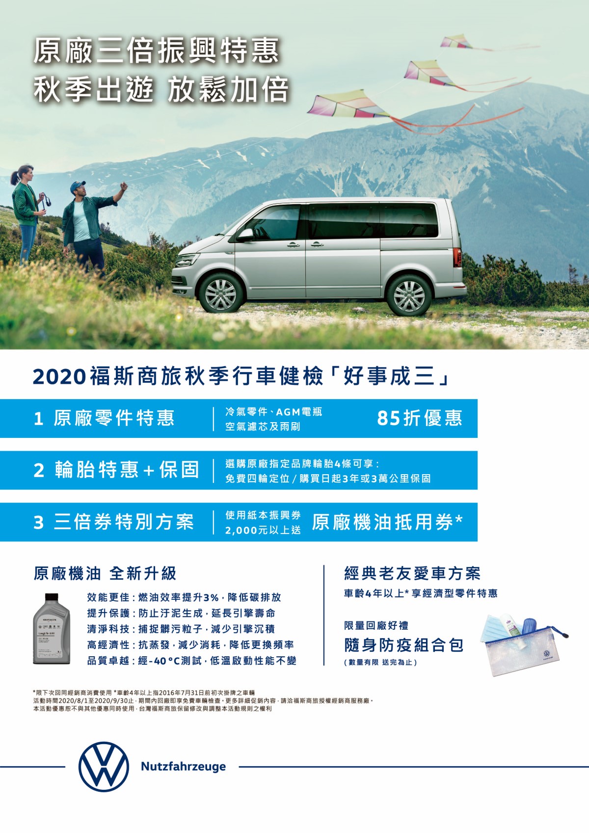 為呼應政府推動防疫新生活運動,秋季健檢期間福斯商旅另外加碼限量回廠好禮,回廠參加秋季健檢就送隨身防疫組合包,內含口罩、乾洗手凝露與紙香皂盒等,數量有限送完為止。
