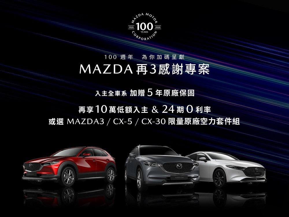 在Mazda 100週年接近尾聲的感恩時刻,「MAZDA 再3感謝專案」提供欲購新車的消費者擁有心目中理想座駕的最佳機會,期待在邁向品牌下一個100年路上,Mazda能伴您一同奔向充滿動力與笑容的生活。