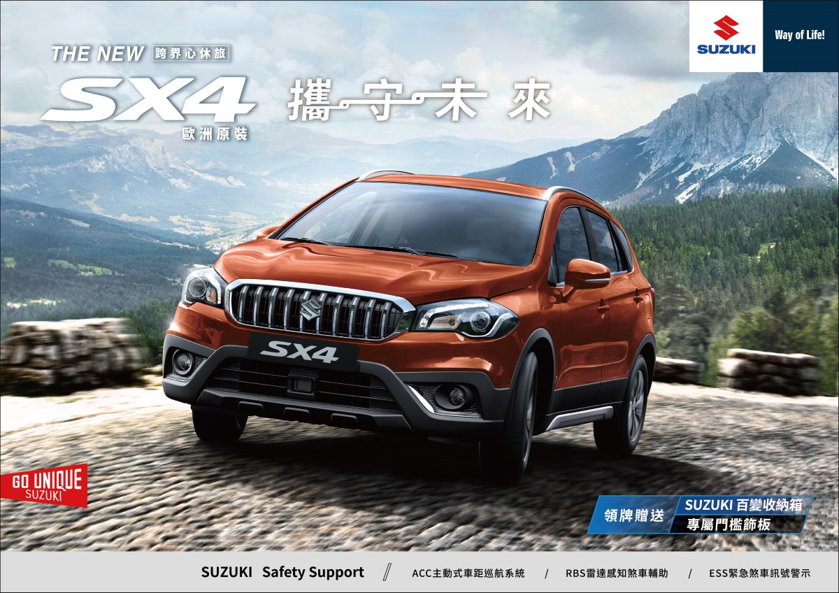 New SX4全新搭載ACC主動式車距巡航系統及RBS雷達感知煞車輔助,以嶄新的智能安全科技,結合優雅的歐式設計及SUV剽悍外型。