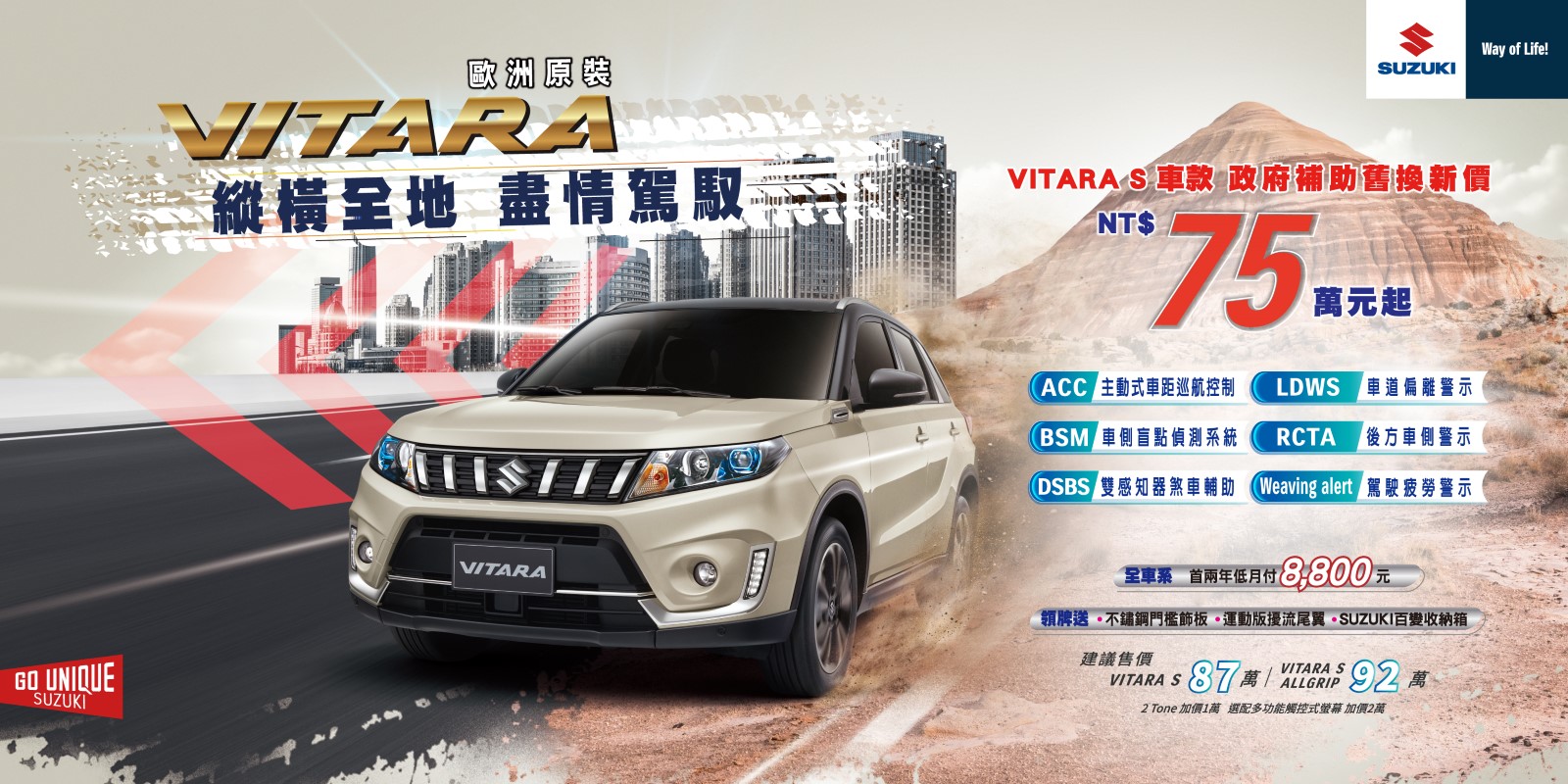 Vitara以小排量大動力的優異性能、同級第一的節能表現外,擁有6大安全系統:ACC主動式安全車距巡航控制、BSM車側盲點偵測、DSBS雙感知器煞車輔助、LDWS車道偏離警示、RCTA後方車側警示、Weaving alert駕駛疲勞警示,更是守護車主與家人的安全。