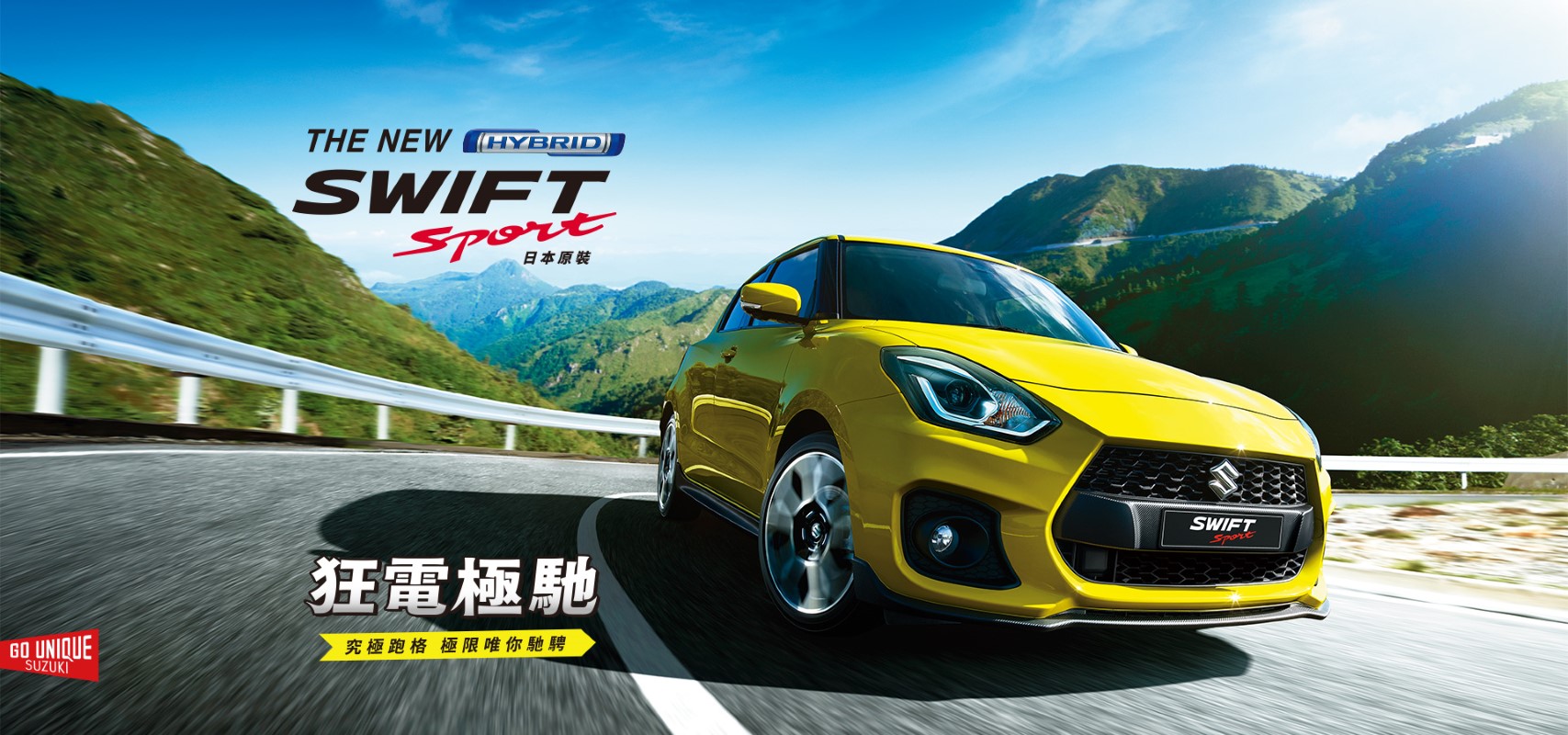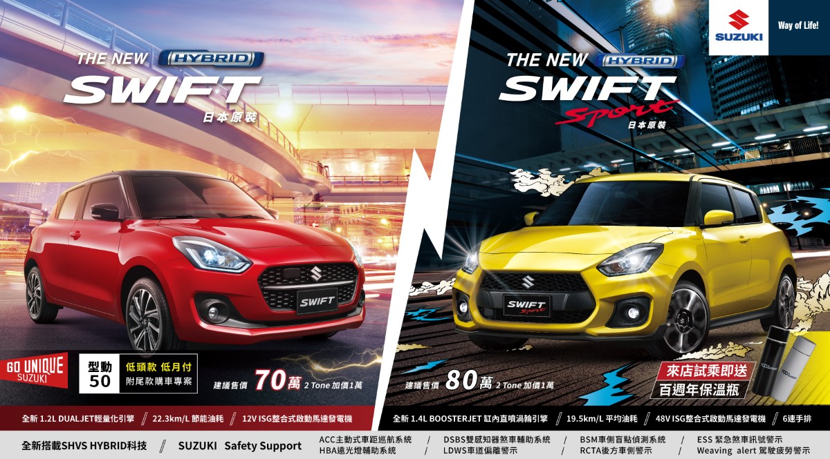 Suzuki最具代表性的跑格小車New Swift | Swift Sport,以日本原裝之姿強勢降臨台灣車壇。承襲「GO UNIQUE」的品牌理念,全新搭載Hybrid複合動力、SUZUKI Safety Support安全科技與新世代輕量化引擎,持續帶給台灣消費者凌駕想像的駕馭樂趣。
