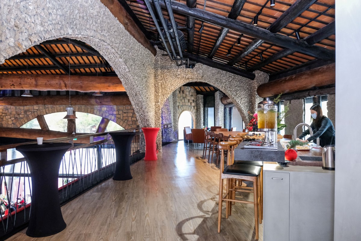 在展間室內部分,則以具明亮、簡約的高科技感打造整體風格,並設立大型的鍍鉻Wing Mark LOGO為據點的精神象徵,確實傳遞Honda Motorcycle 「Be Your Wing」的品牌精神,結合精品櫃、精神主題牆等設計,並配合著臨近的台灣國定古蹟億載金城的歷史氛圍,全店大量使用木質與石製等內部裝潢,搭配Honda Motorcycle的車輛與科技理念,呈現出復古與現代的完美交織,塑造Honda Motorcycle的旗艦店風範。