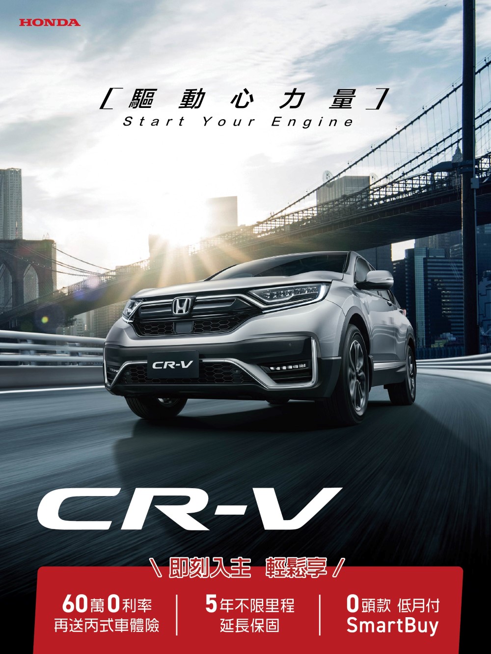 即日起至6月底止推出加碼限時優惠活動,凡於活動期間入主Honda New CR-V車系,可獲得購車「60萬0利率」+「丙式車體險」+「五年不限里程延長保固」等三重獻禮。