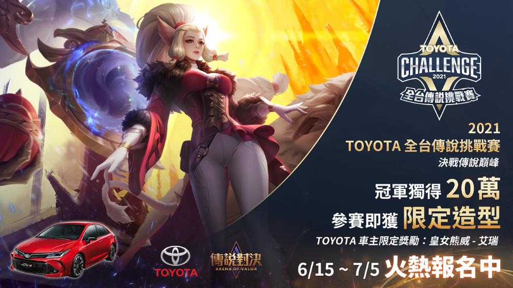 「TOYOTA全台傳說挑戰賽-決戰傳說巔峰」即日起至7月5日(一)開放報名,7月10日(六)正式開打,挑戰賽的獲勝隊伍將於8月7日(六)進行最終總決賽,冠軍隊伍可獨得20萬元高額獎金!有興趣共襄盛舉的玩家們,可以前往Toyota全台傳說挑戰賽報名網址(https://vs.cga.gg/tournament/Toyota_AoV_2021)進行報名。