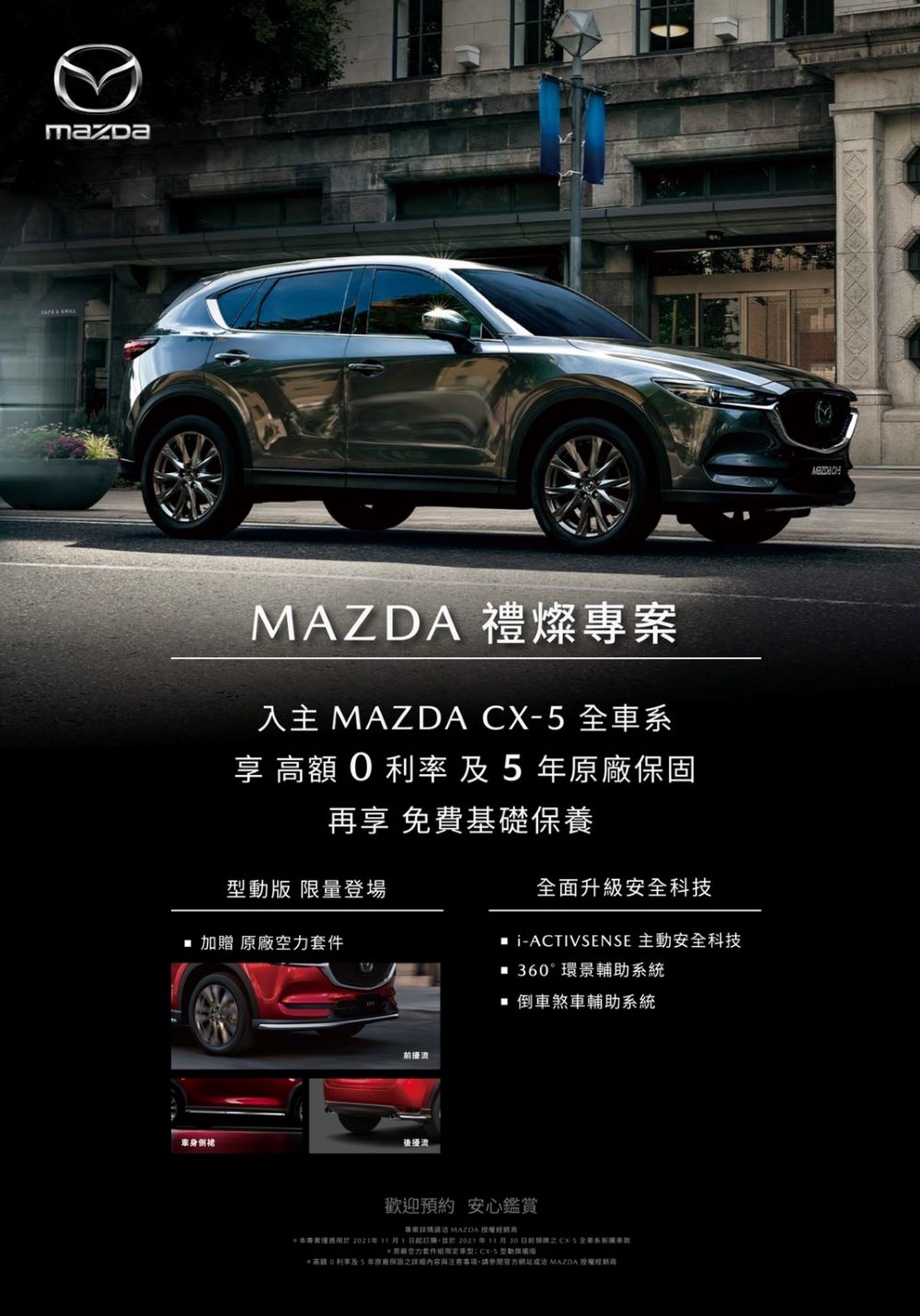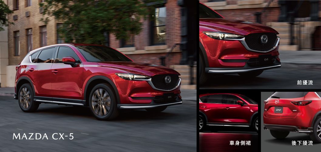 台灣馬自達本月加碼推出「禮燦專案」,入主 Mazda CX-5 即享「高額0利率」,再享「5年原廠保固」,再贈「免費基礎保養」, CX-5 型動旗艦版車型更加贈「限量原廠空力套件組」,包含前擾流、車身側裙及後擾流,賦予車身獨特外觀,展現更加精煉的動態線條。