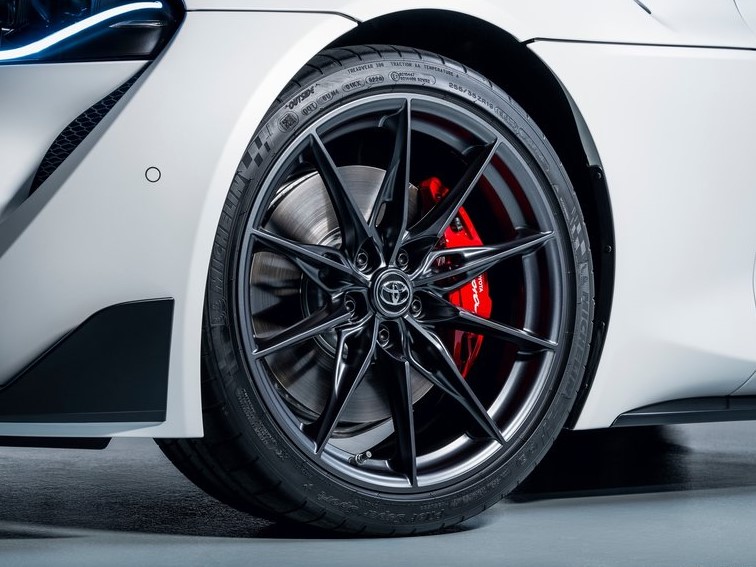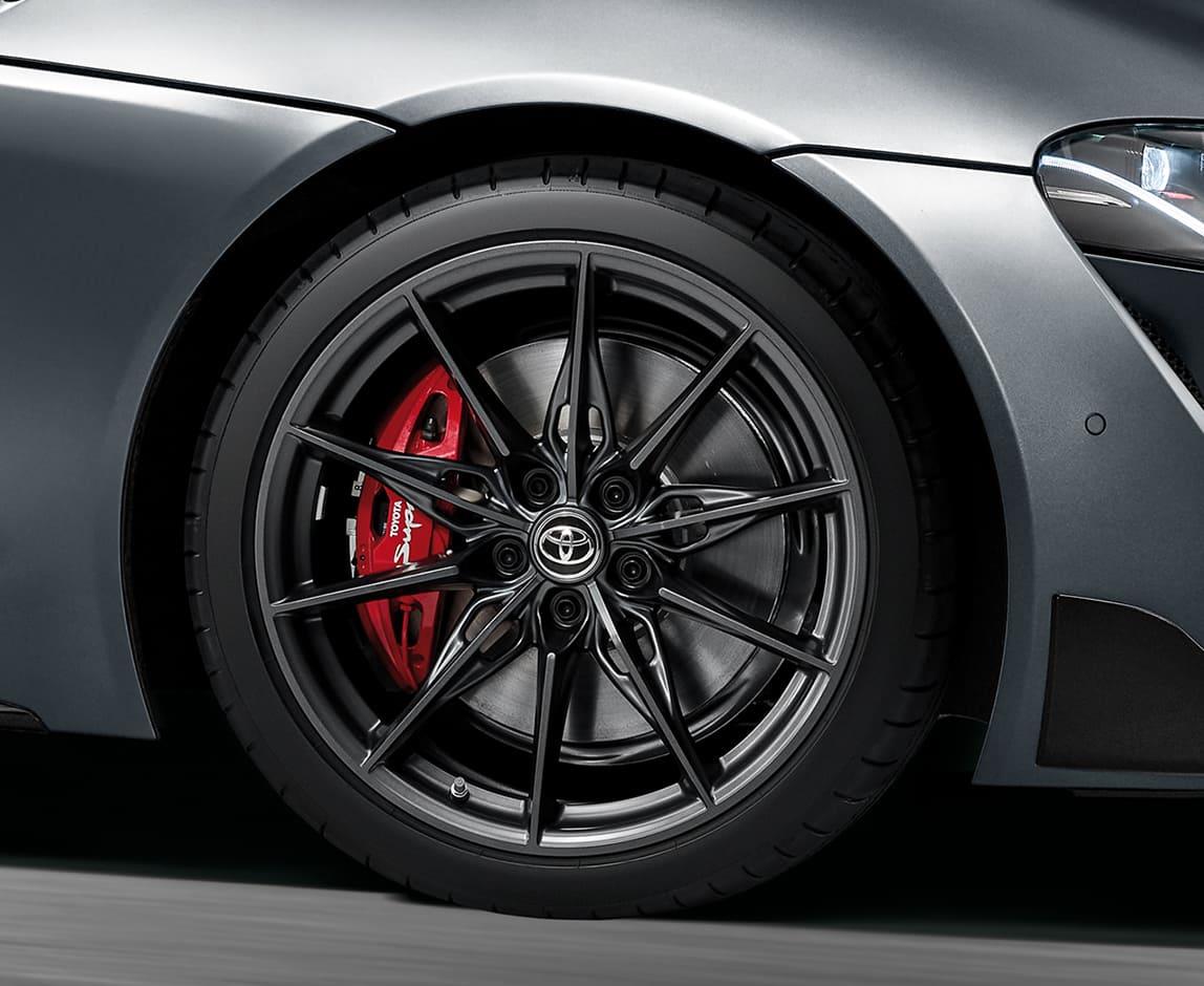 全新改款的Toyota GR Supra皆搭載全新19吋鍛造輪圈,調整輻條和橫截面形狀,讓鋁圈的重量更輕、剛性更為提升,有助於提高操控穩定性。