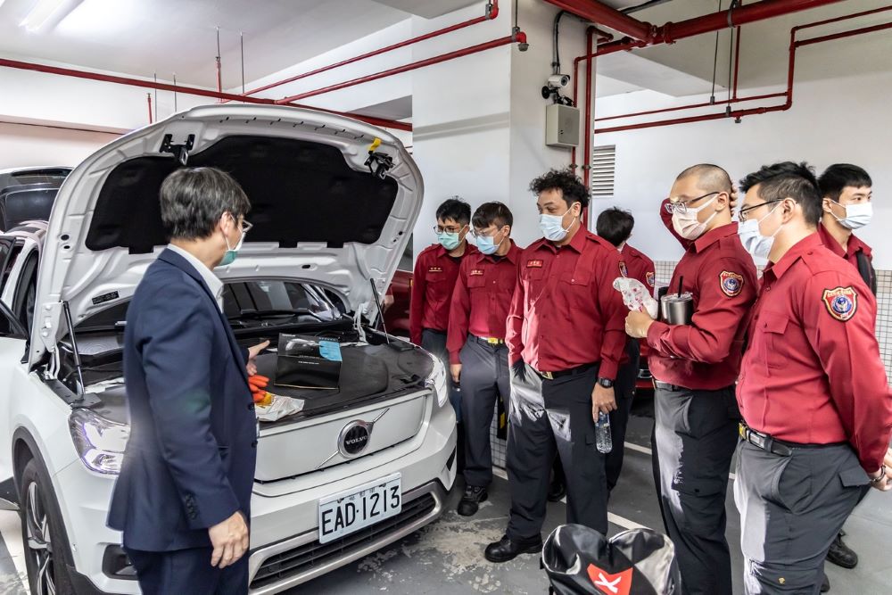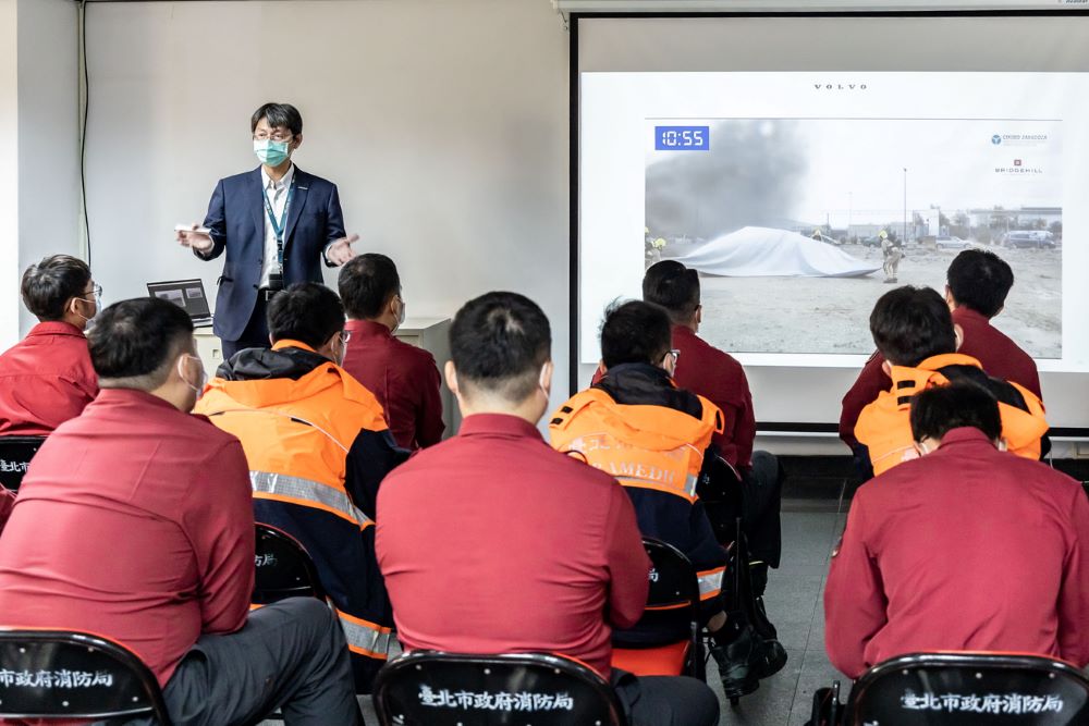 持續完善布電計劃與推動電動車售服專業人材養成之餘,日前 Volvo電能發展規劃暨培訓副理- 林柏勳受邀台北市消防局訓練講座分享電車消防安全。