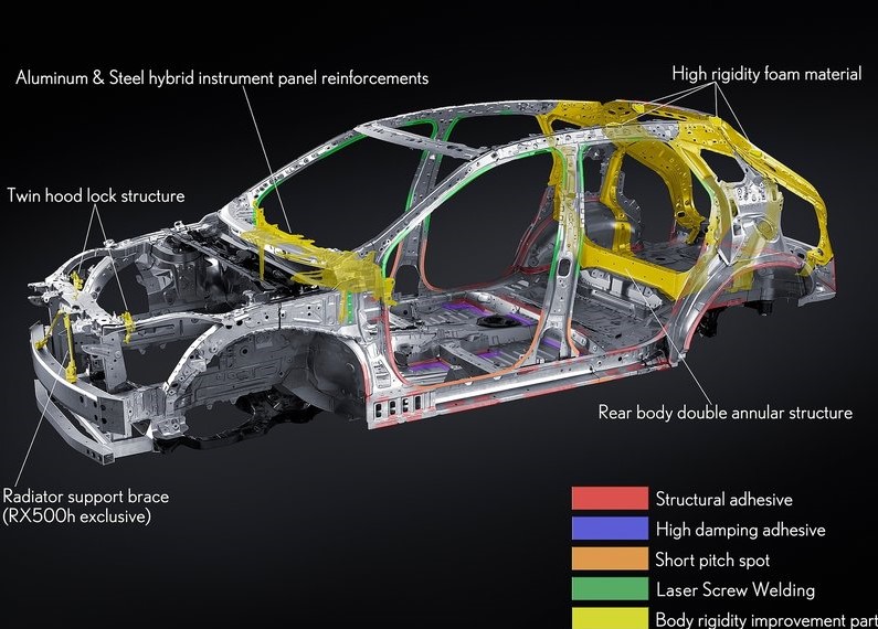 最後,RX之車體工程也大幅強化,包含B柱採用達2G Pa超高張力鋼材製作、焊點密度增加、以及雙環狀的車尾結構設計,均大幅提升車體的剛性表現。