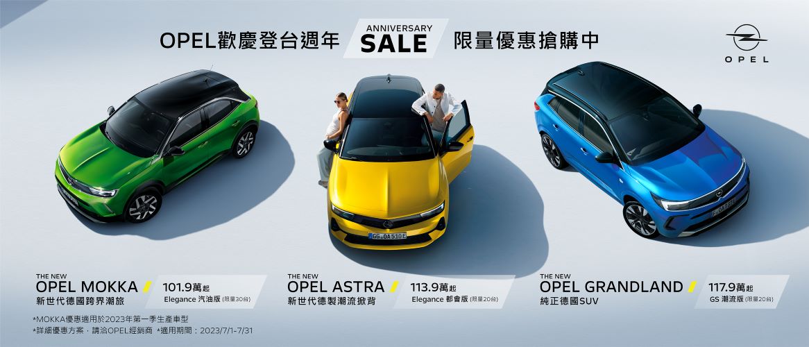 Opel台灣總代理 歐吉汽車歡慶成立週年,即日起至7月31日止,限量推出購車優惠專案,以滿滿誠意回饋喜愛Opel的車迷朋友們。