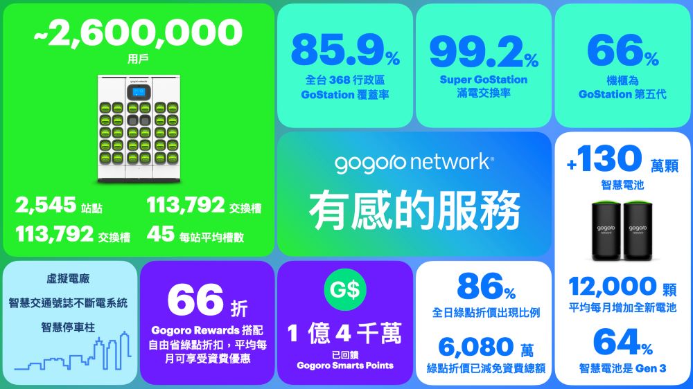 廣度、密度、量能再升級,平均每站 45 個電池槽、每月增加 12,000 顆全新電池,資費折抵超有感,車主使用綠點與 Gogoro Rewards 共省下 1.5 億。