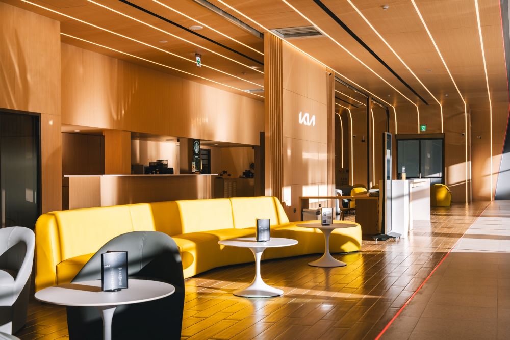 Kia高雄民族展示中心的客戶區利用井字型燈光設計,搭配大量木質建材交錯,創造貼近自然、無壓力的賞車體驗。