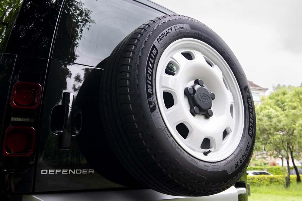再來是專屬車貼、經典20吋白色鋁圈,讓短軸Defender 90緊湊車身比例更顯俐落霸氣。同時,Defender 90短軸版本原廠標配外露式備胎,還可選配同色備胎蓋,再搭配雙色車頂,視覺意象加倍。