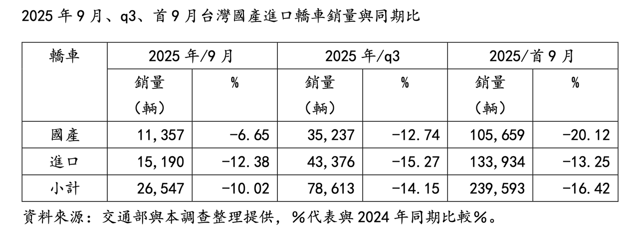 但無奈2025年q3(7、8、9)轎車銷量,仍創下歷年q3最低紀錄,因此,2025年首9月台灣轎車銷量23萬9,593輛,亦是歷年首9月新低紀錄,同期衰退16.42%。