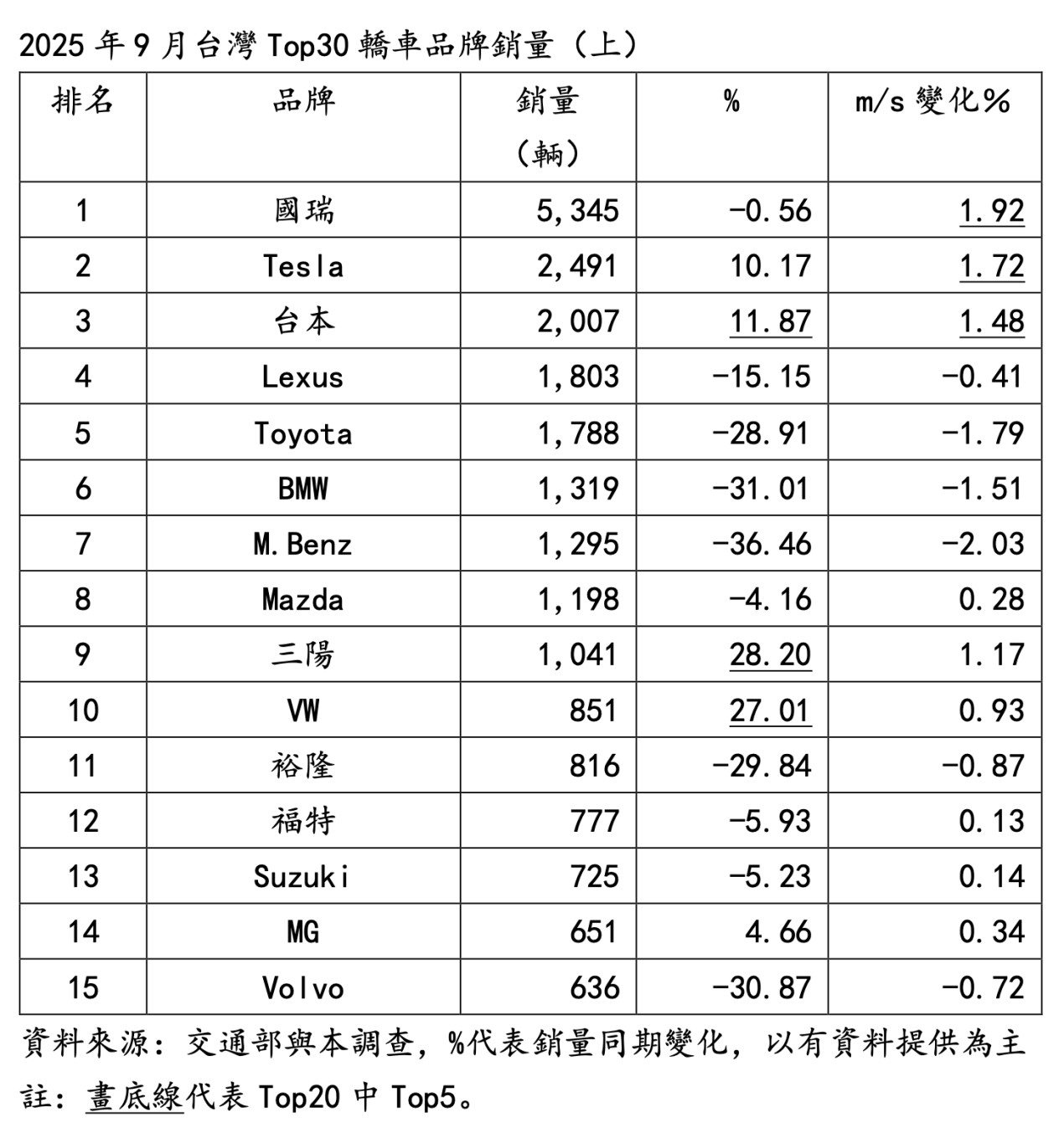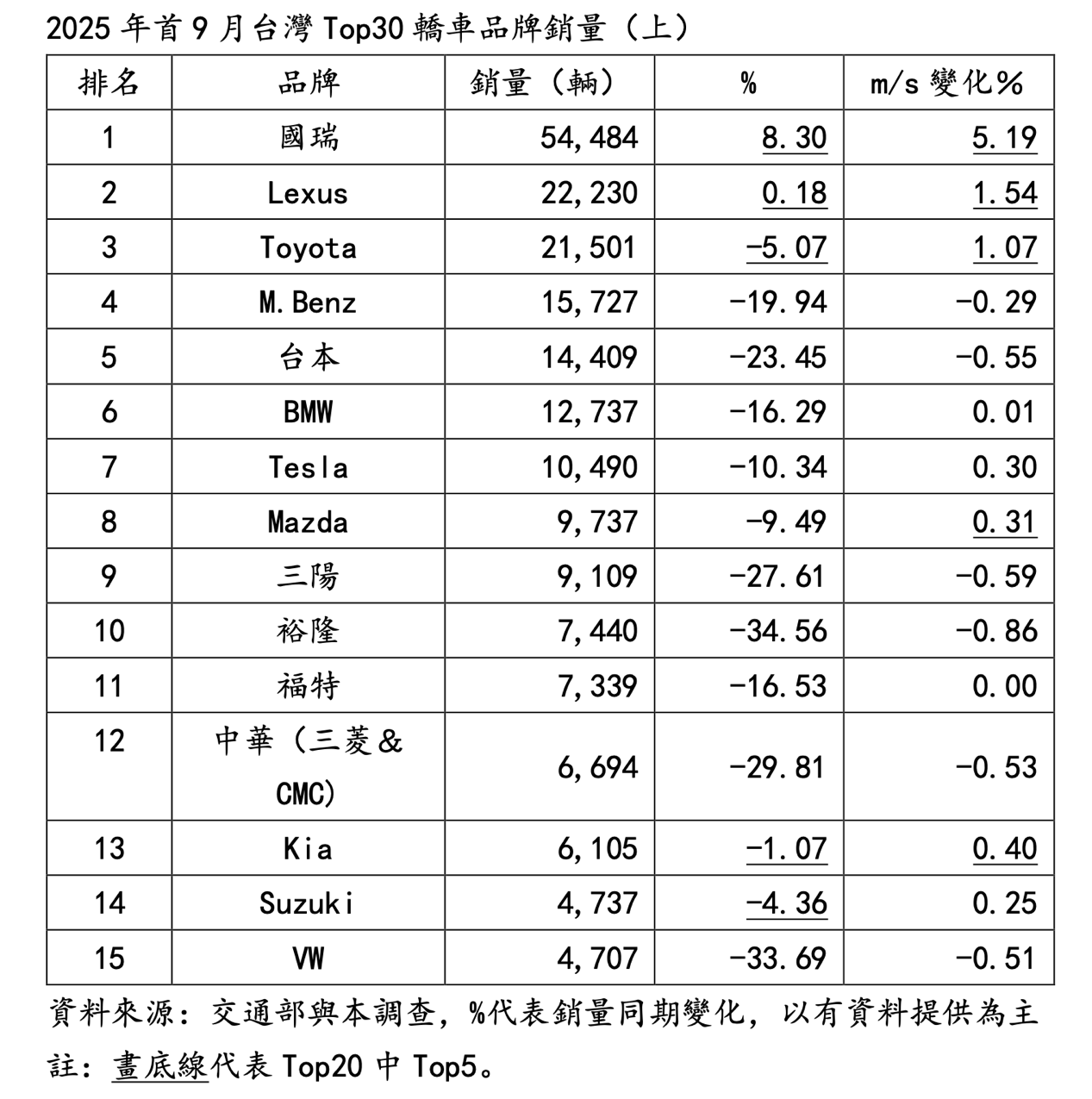 如綜觀2025年9月台灣轎車品牌Top20,最大特色應是