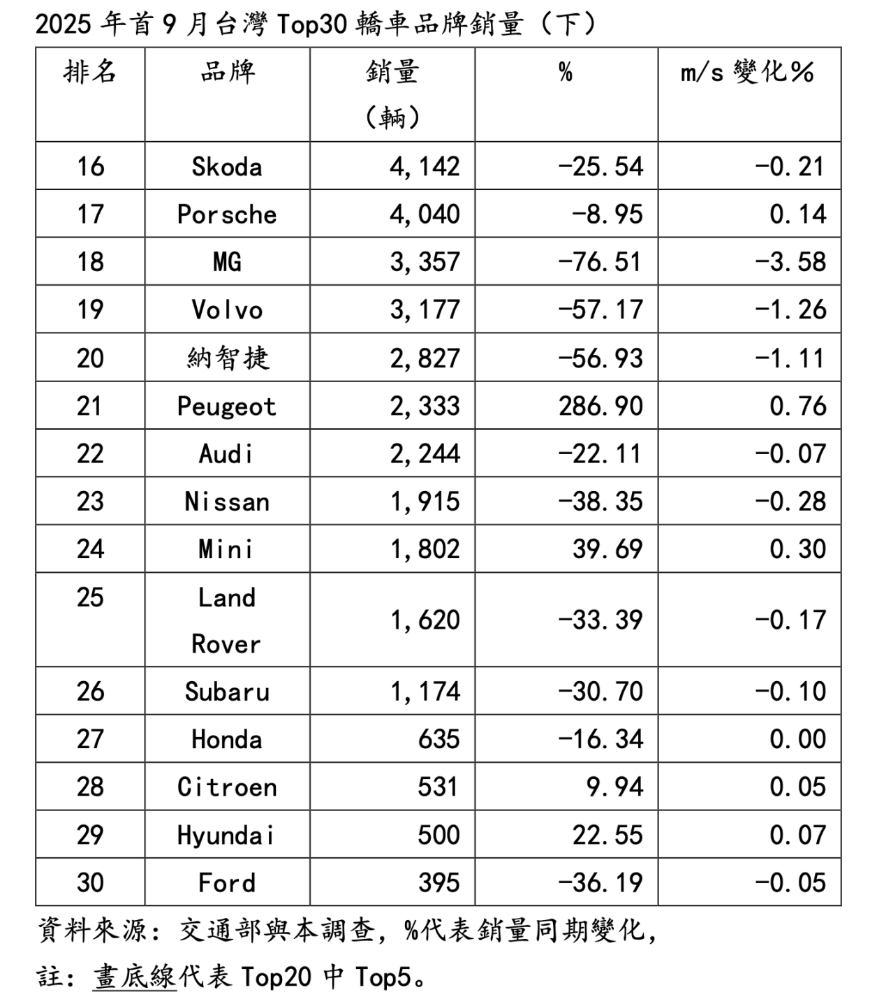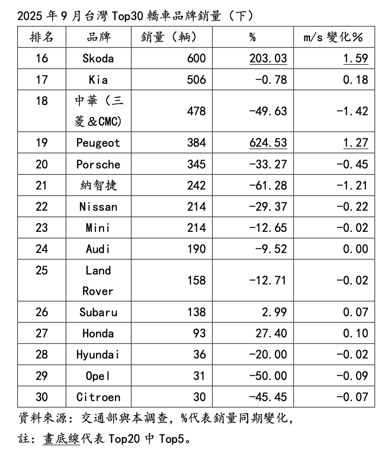 因而Skoda、Peugeot成功擠進2025年9月Top20品牌之列,而2024年9月No.16 納智捷、No.20 Nissan落在20名之外了。
