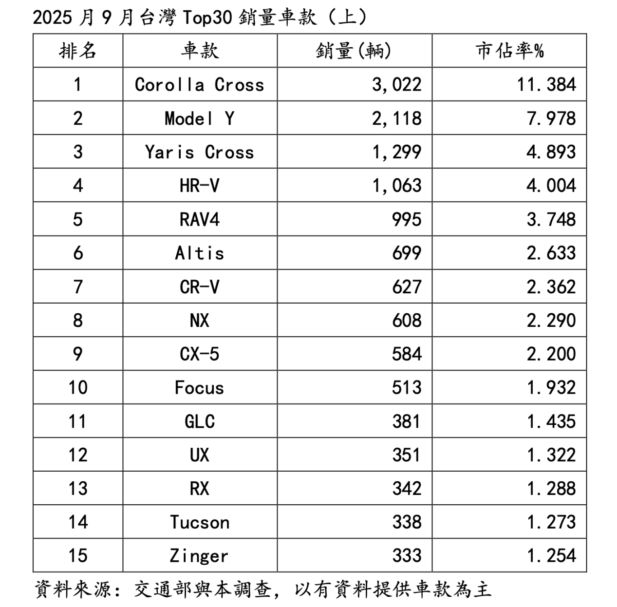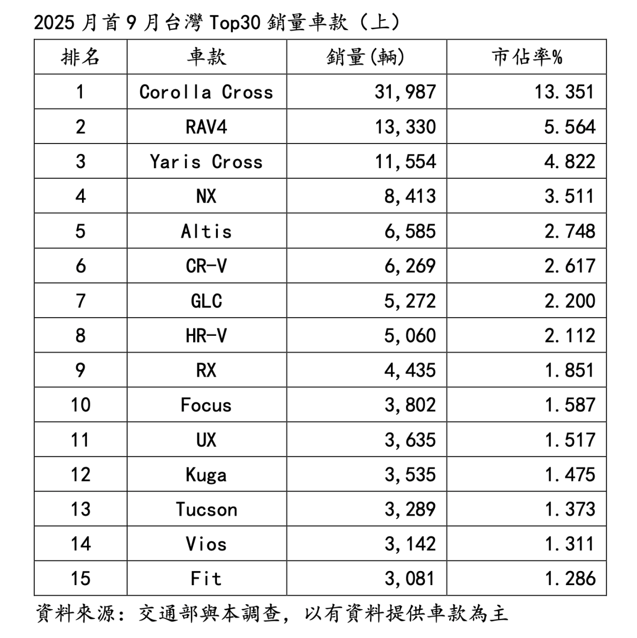 「叫我神車」?!國瑞Corolla Cross是2025年首9月賣3萬1,987輛是No.1,同期成長43.39%、市佔率同期擴張5.57%也名列Top30車款No.1。