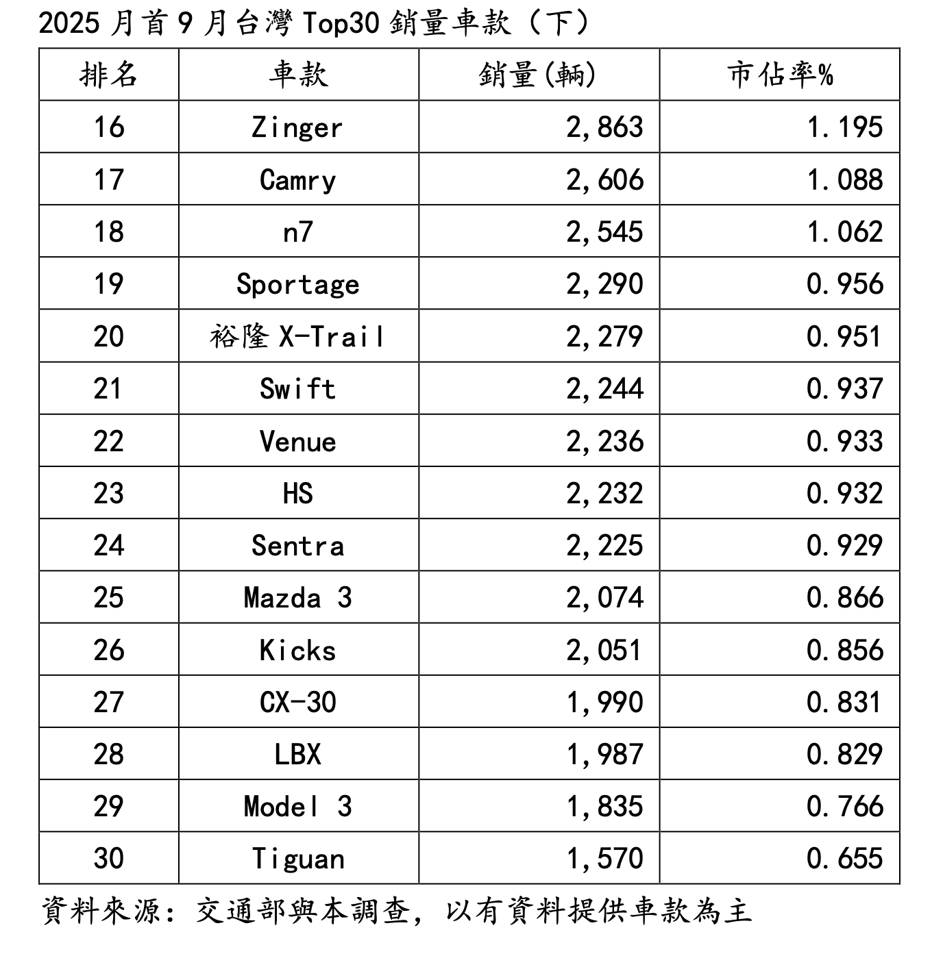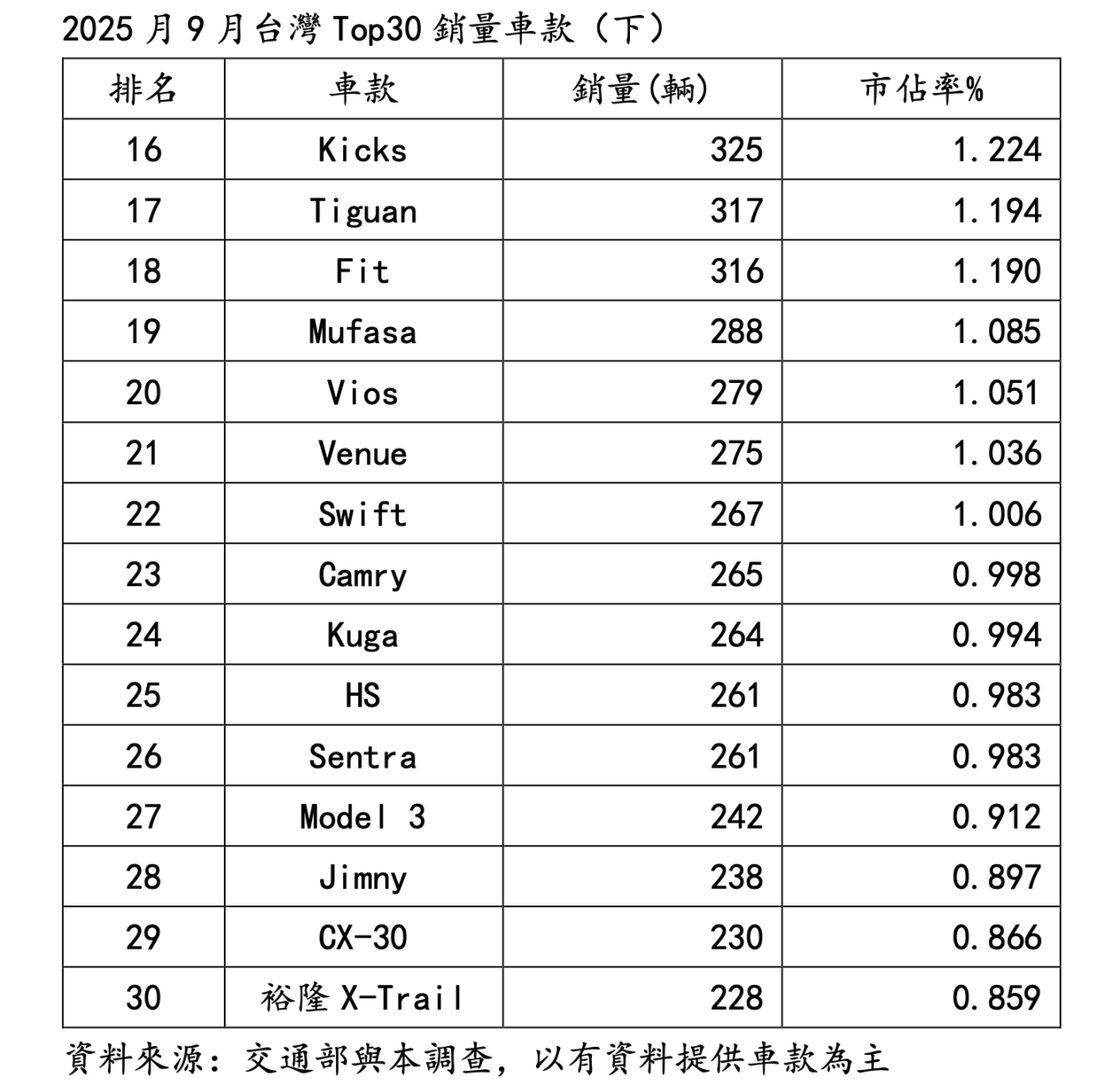 另外,9月Top30車款銷量名次同期前進也精彩!