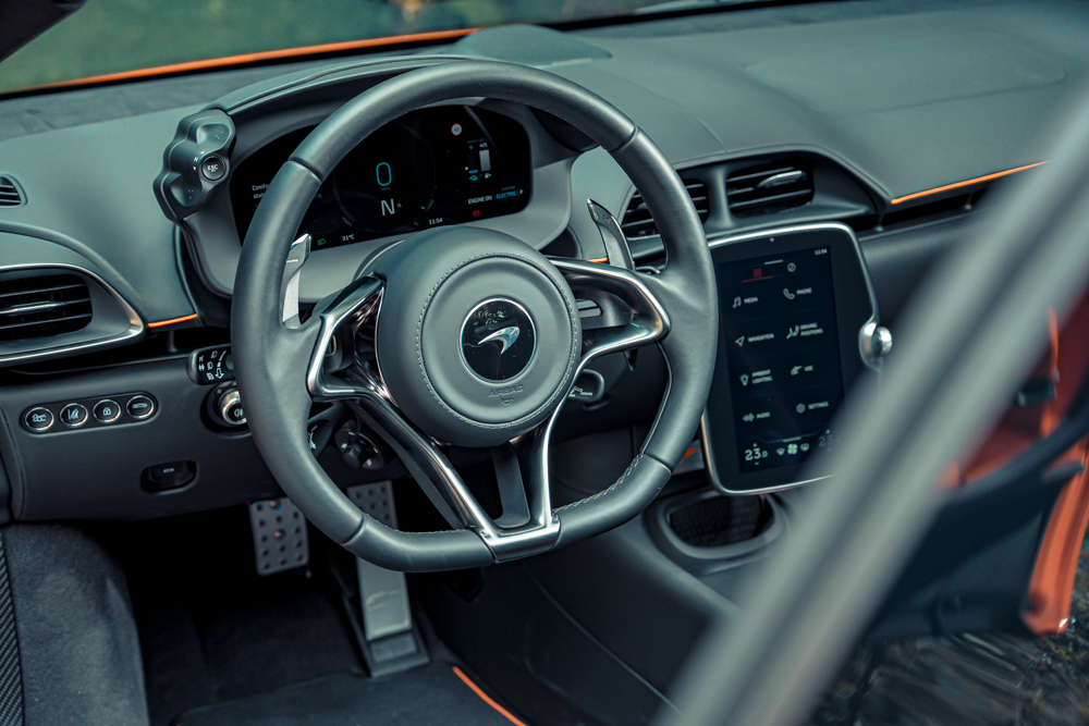 值得一提的是,McLaren堅持不在方向盤上設置功能按鈕,車輛控制功能集中在中控螢幕。這並非省略,而是刻意讓駕駛者更專注。使用方面,上掀式車門更省力,關門時還具備自動吸入功能。