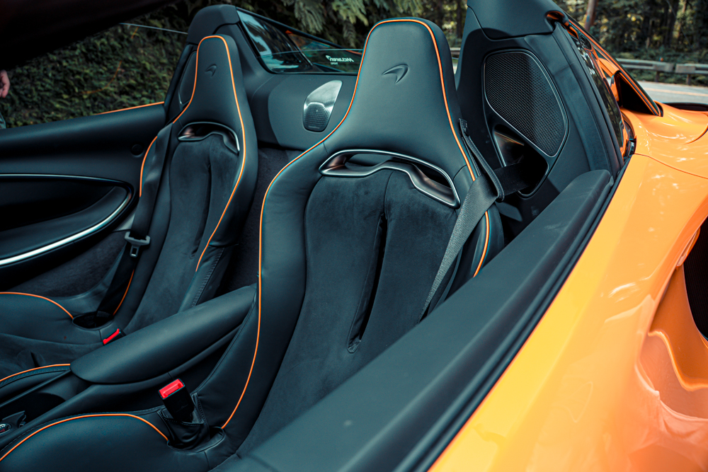 試駕車的座椅為椅背固定型式,重量更輕,找到適當駕姿並不難。為了營造更適合開篷車的駕駛音場,McLaren 特別重新配置喇叭位置,搭配 Bowers & Wilkins 12 支喇叭頂級音響系統,開篷狀態下也能維持出色聽覺。