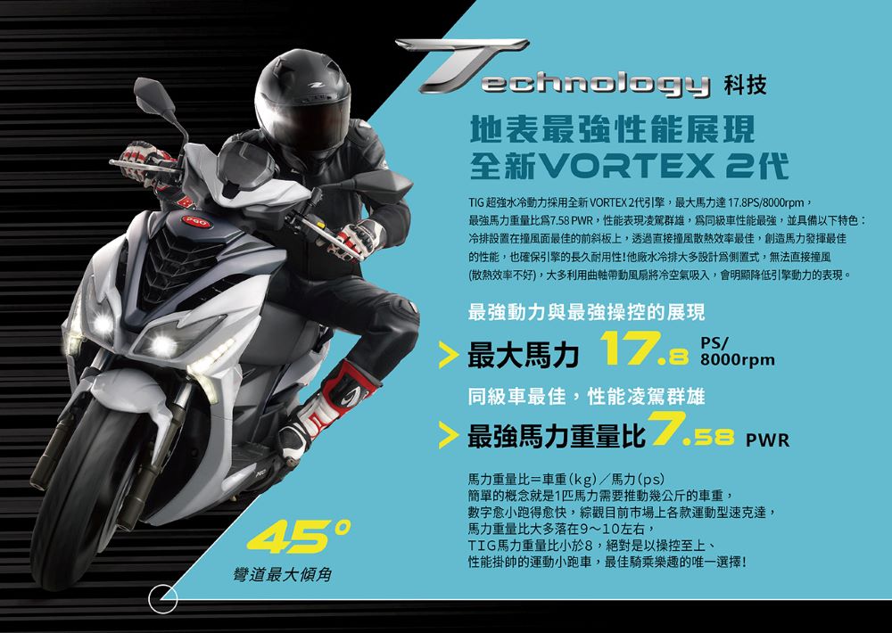 搭載 Vortex 2代水冷引擎,最大馬力達 17.8 PS/8000rpm,馬力重量比達 7.58 PWR,性能表現穩居同級之最。