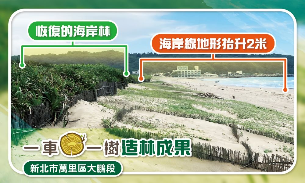 新北市萬里大鵬段海岸造林透過堆砂籬、防風圍籬及水寶盆技術,恢復林地且整體地形抬升2公尺(圖:慈心基金會提供)