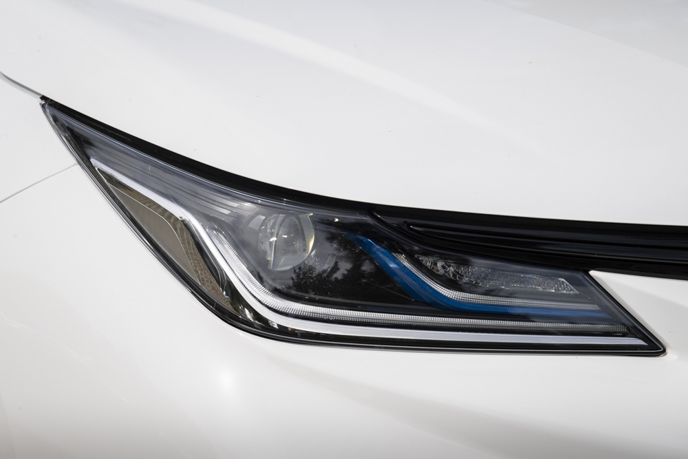 相較於一年多試駕的Altis GR Sport,新版Altis Hybrid GR Sport外觀設計幾乎一致。主要差異在於,回歸油電後車身多處追加HEV字樣,LED頭燈組換上Hybrid專屬的湛藍色識別光條。