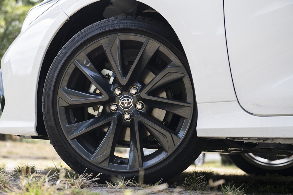 整體來看,Altis Hybrid GR Sport視覺更具分量感,G字格柵、GR 專屬銘版、兩側方形霧燈框…視覺更立體、視覺存在性更強。車側維持黑色鋼琴烤漆後視鏡、鯊魚鰭天線,輪胎升級為18吋霧黑雙肋五幅輪圈(輪胎規格225/40 R18),搭配與抓地力不錯的Dunlop SP Sport MAXX 050運動胎。