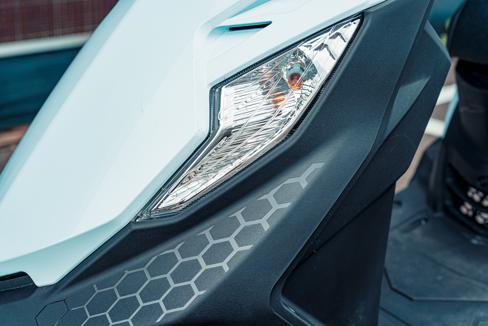 實車觀察,不難發現isavR威力125從外型到配備瞄準的是「實用+未來感」。稜角線條、六角頭燈、蜂巢咬花…造型呈現出未來風格。全車採用六邊蜂巢式咬花結構,呈現幾何邏輯與視覺焦點,科技感比一般通勤125機種更鮮明。