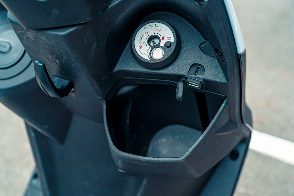 再來是實用,isavR威力125坐墊特別長、753mm低座高,坐姿三角點經過優化,載小朋友上下學不成問題。再來是37公升車廂,可放入兩頂半罩安全帽、雨具。還有6.9 吋手機安心插槽、QC3.0 USB 充電座…使用上頗為貼心。