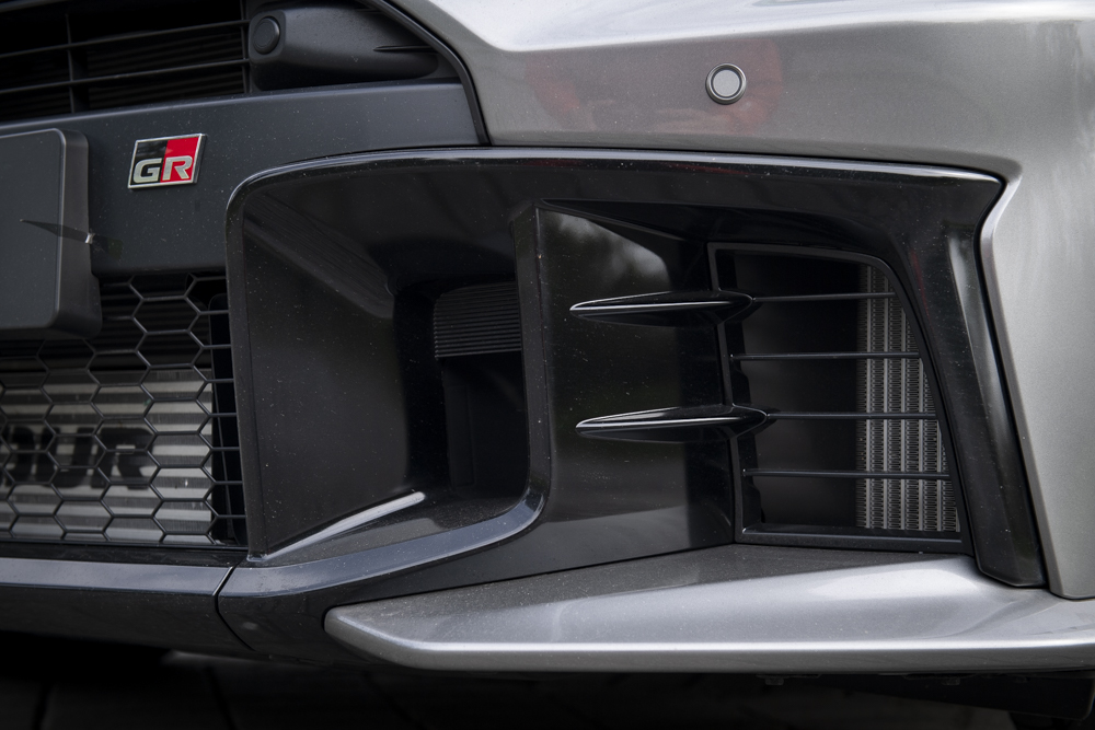首先是機能強化,大燈組維持原樣,前保桿改為易於更換調整的三片式結構,這是經過賽事回饋的調整,可提升維修便利性、降低參賽成本。最顯眼的變化是保桿左右側新增開孔,這是針對自排車車型安裝ATF自排油冷卻器而生的設計(6MT手排則為封閉)。