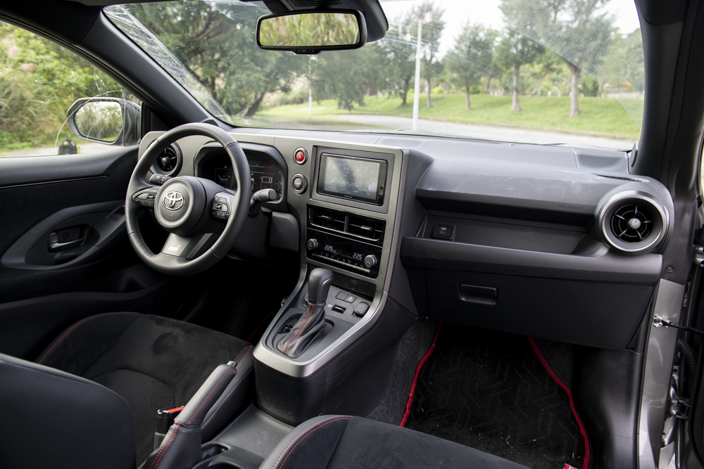 數位化界面為12.3吋全液晶儀表,可支援多種模式切換。中控台採用特殊GR Gun Metallic消光塗裝,能有效抑制陽光反射、防止目眩。坐姿調整則是針對使用回饋進行改良,雙前座BRIN NAUB®類麂皮賽車桶椅高度降低25mm,戴全帽下賽道頭部空間不再侷促。