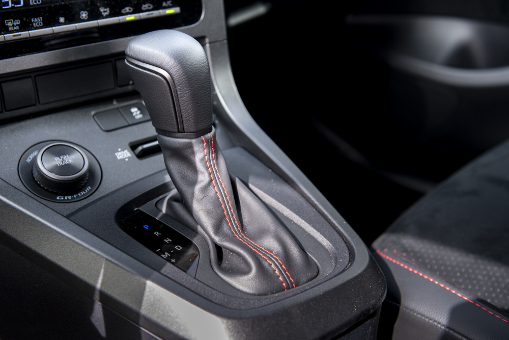 GR-DAT八速手自排變速箱綿密齒比比六速手排更綿密,加速感更強,運行速域更寬廣。還具備Launch Control彈射起步功能,彈射轉速設定在 5000rpm,排檔桿手動模式採「往上降檔、往下升檔」的賽車化邏輯。不同於傳統自排,具備「預判」功能,能根據駕駛者的油門、煞車細微動作提前決定檔位。