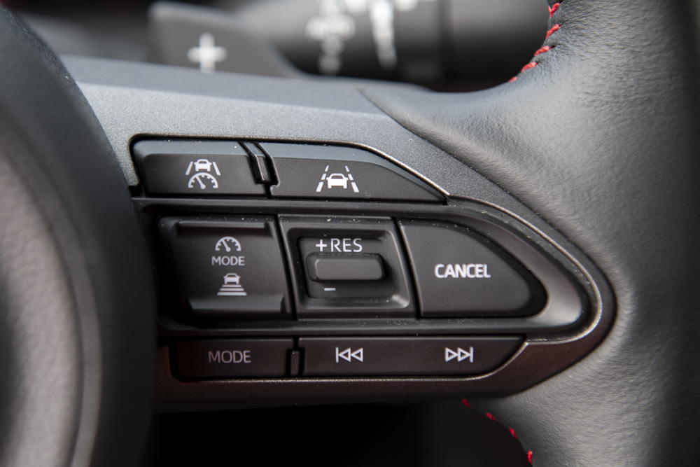 GR Yaris自排座艙也是比照小改款進化版,看起來好像沒啥不同,其實經歷多處更新。以人因工學設計為主導,中控操作面板朝向駕駛者傾斜15度,主要控制介面一一集中在720mm範圍內,更易於操作。儀表板頂部下降50mm,加上後視鏡位置上移,藉以提升前方視野。