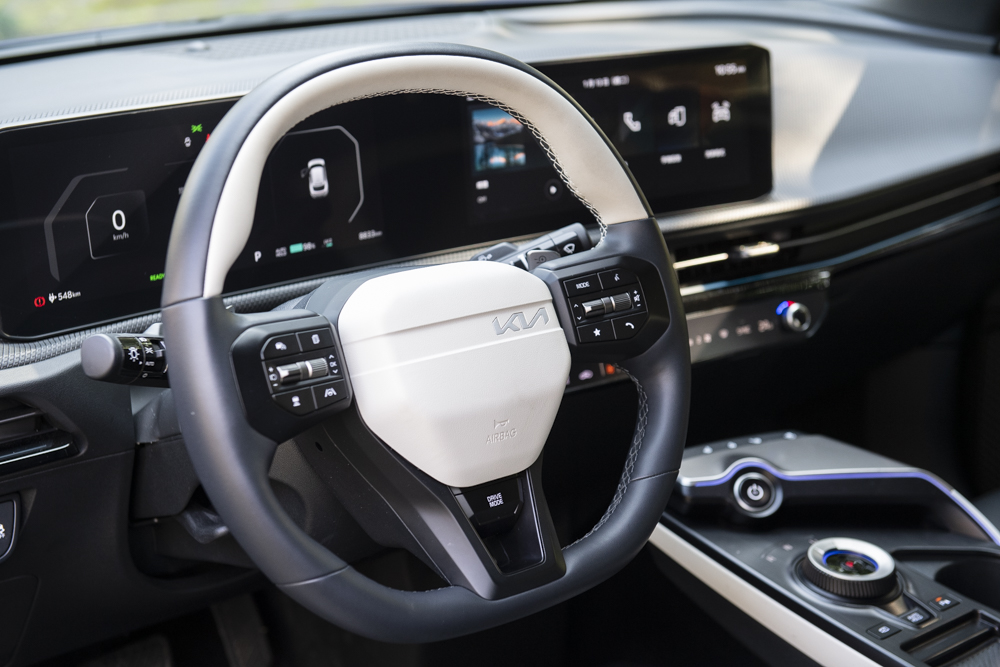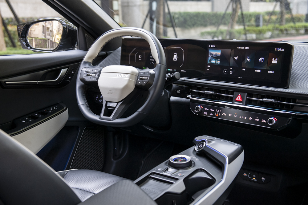 進到室內,儘管基礎輪廓不因小改款而改變,細節優化卻讓整體質感、操作直覺大幅提升。首先是手感,首度配置GT-Line專屬三幅式真皮電容感應方向盤,握感與視覺更具跑格。再來是新世代介面,雙12.3吋曲面螢幕改為方正邊框,內部UI換上新型圖像介面(同EV9),並支援無線Apple CarPlay與Android Auto。