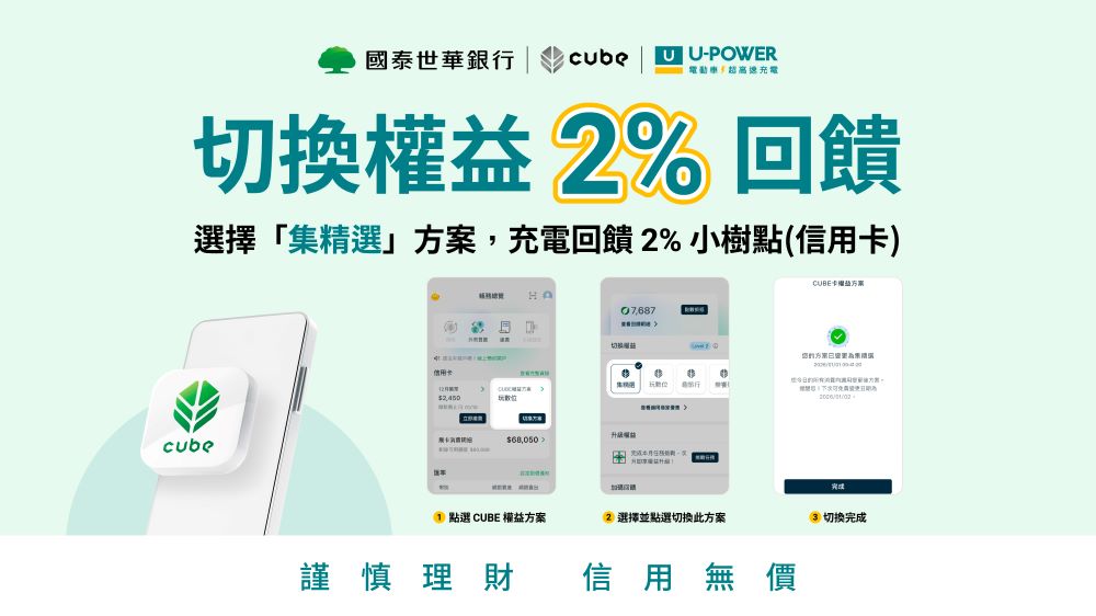 U-POWER 攜手國泰世華銀行推出 CUBE 信用卡充電回饋方案,三大任務合計最高可享 12% 小樹點(信用卡)回饋。