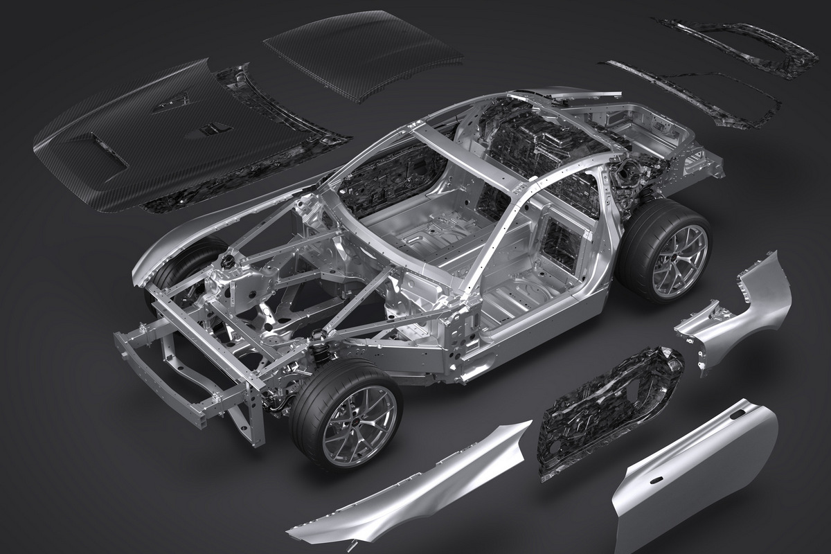 車身採用鋁合金車架搭配引擎蓋、車頂等部位碳纖維,車重控制為1,750kg。