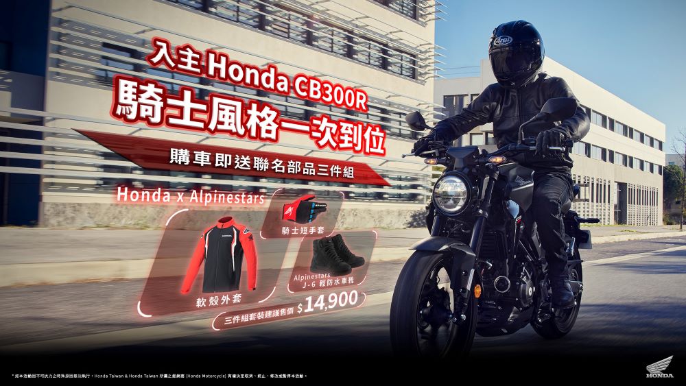 Honda Taiwan於2026年3月推出多項購車優惠專案,針對Neo Sports Café風格的CB300R,推出「騎士風格一次到位」專案,訂購CB300R並完成領牌,即送Alpinestars聯名部品三件組。