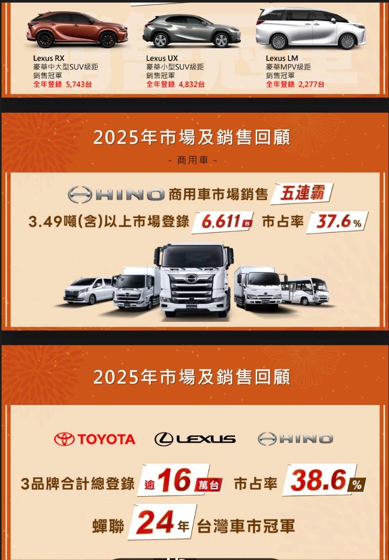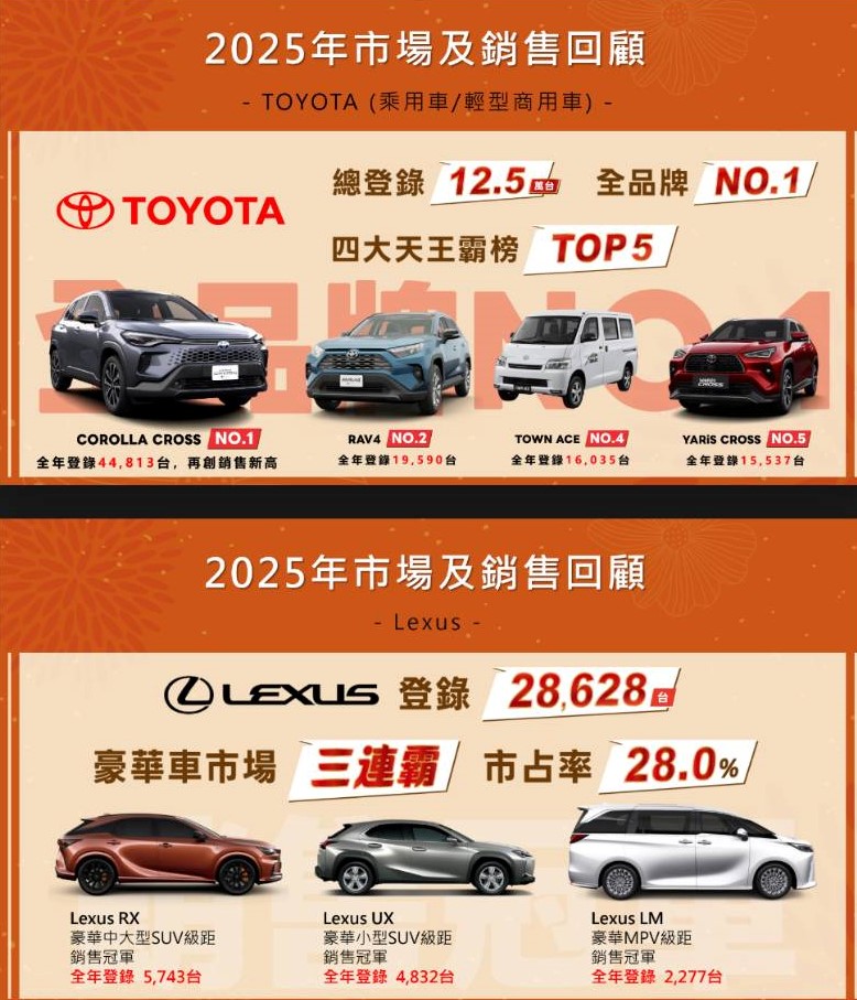 2025年三品牌合計市佔率達38.6%,連續24年蟬聯台灣車市銷售冠軍;其中Toyota單一品牌市佔率更超過 30%,穩居市場龍頭。