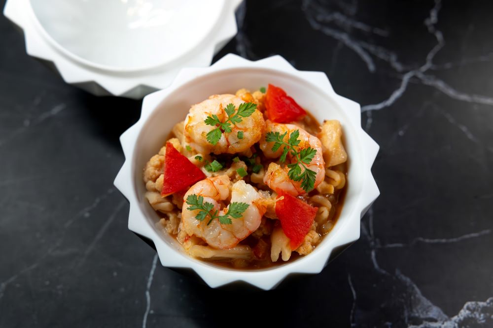 除了正式菜單外,當晚主廚也特別準備一道Lexus車主專屬隱藏版料理,將Lexus品牌精神轉化為料理創作的一部分,料理以甜蝦與蝦汁燉薏仁為核心,底層薏仁吸附蝦汁鮮味,帶出溫潤而沉穩的風味基調,上層則以炙燒甜蝦點綴其上,呈現鮮甜與香氣的對比。藉由簡單卻細緻的食材組合呈現層次風味,透過對細節的講究與長時間淬鍊,呈現沉穩精準而平衡的質感。