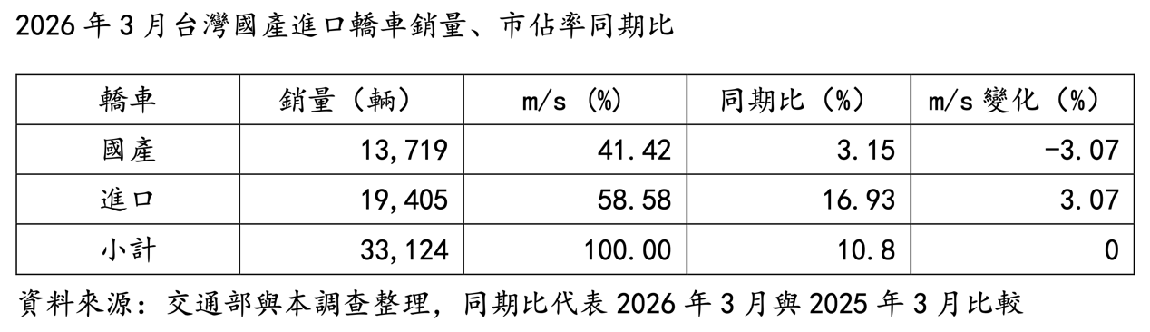 2026年3月台灣轎車總銷量3萬3,124輛、同期成長10.8%;其中,進口轎車1萬9,405輛、創歷年3月新高、同期成長16.93%,國產轎車1萬3,719輛、同期成長3.15%。