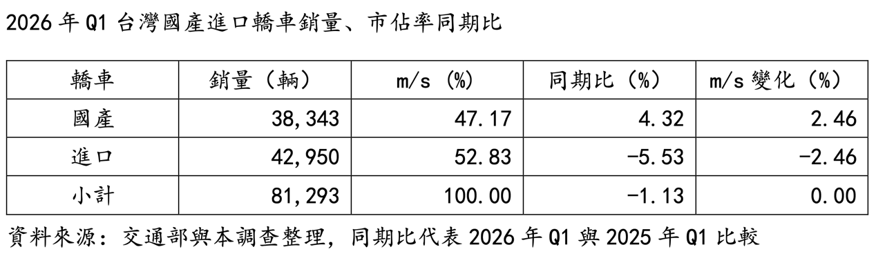 3月亮眼表現也略為扭轉2026年Q1整體低迷態勢,累計台灣轎車銷量約81,293輛,同期衰退1.13%。