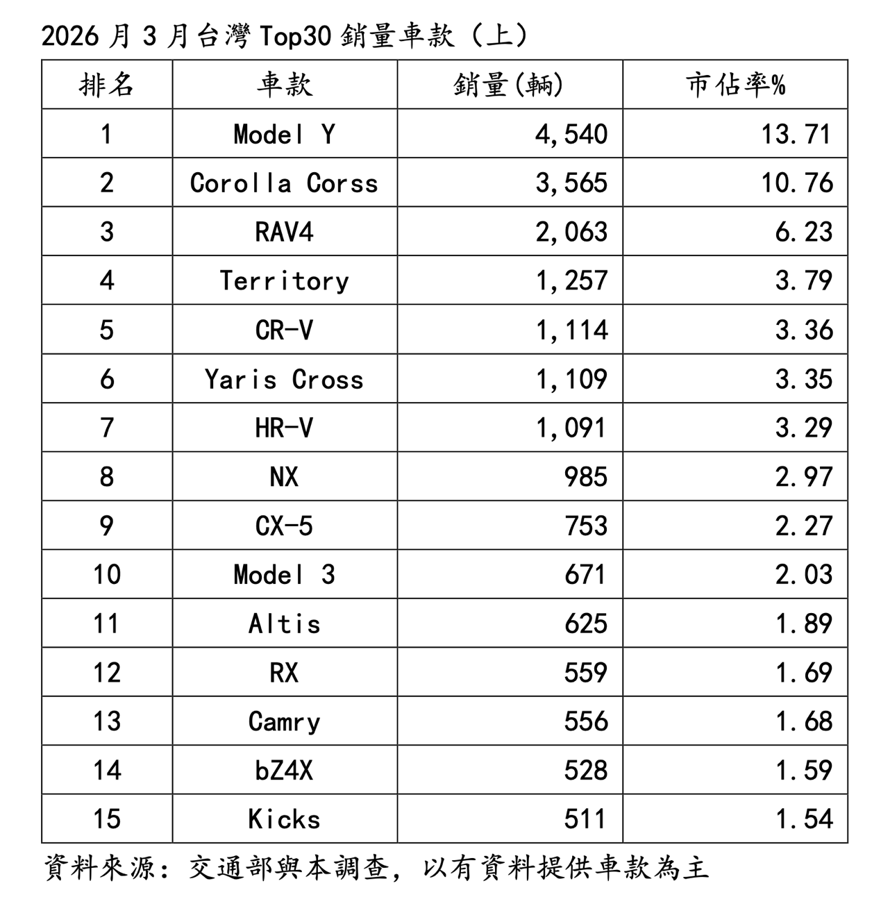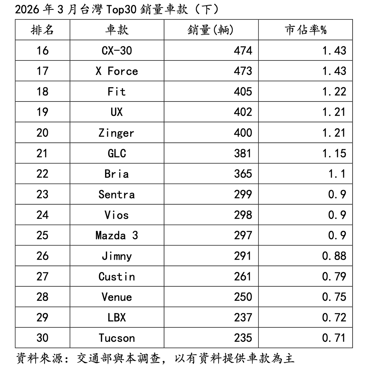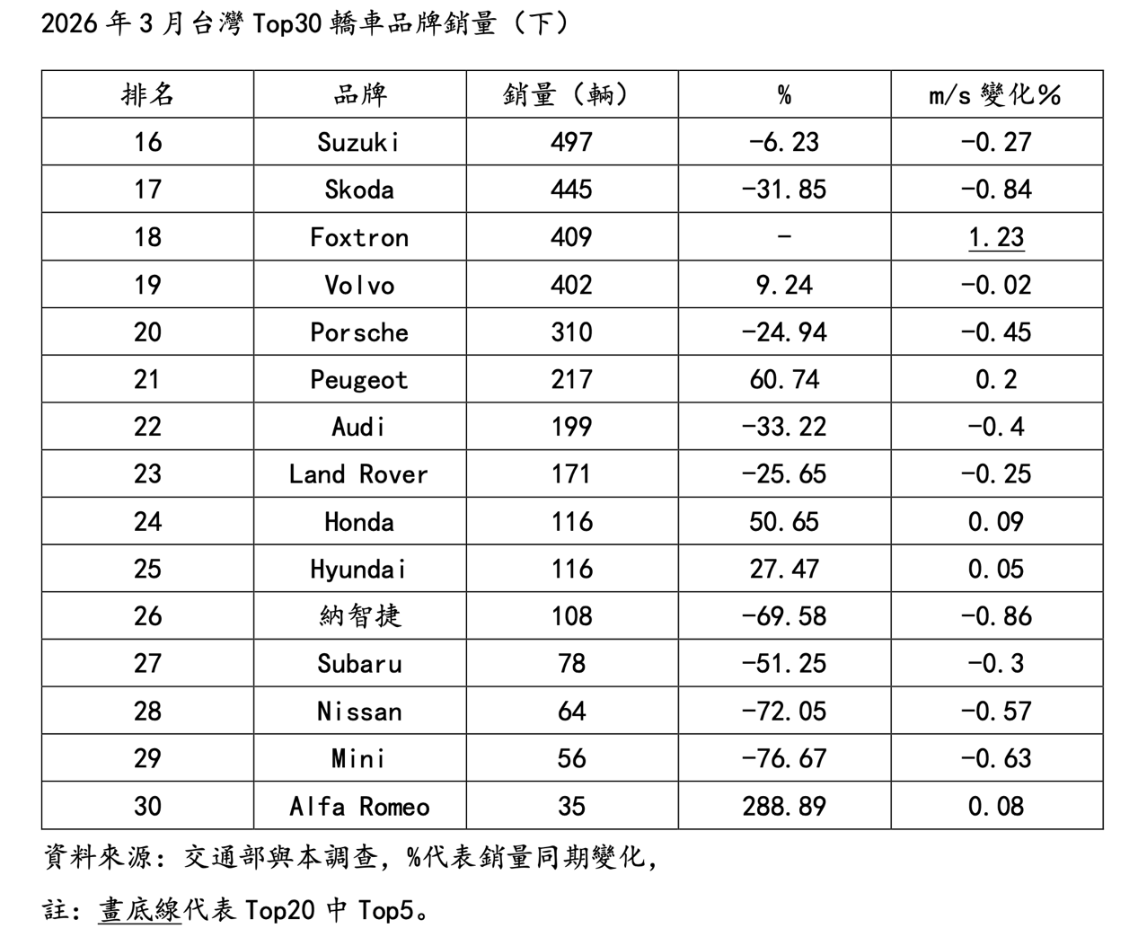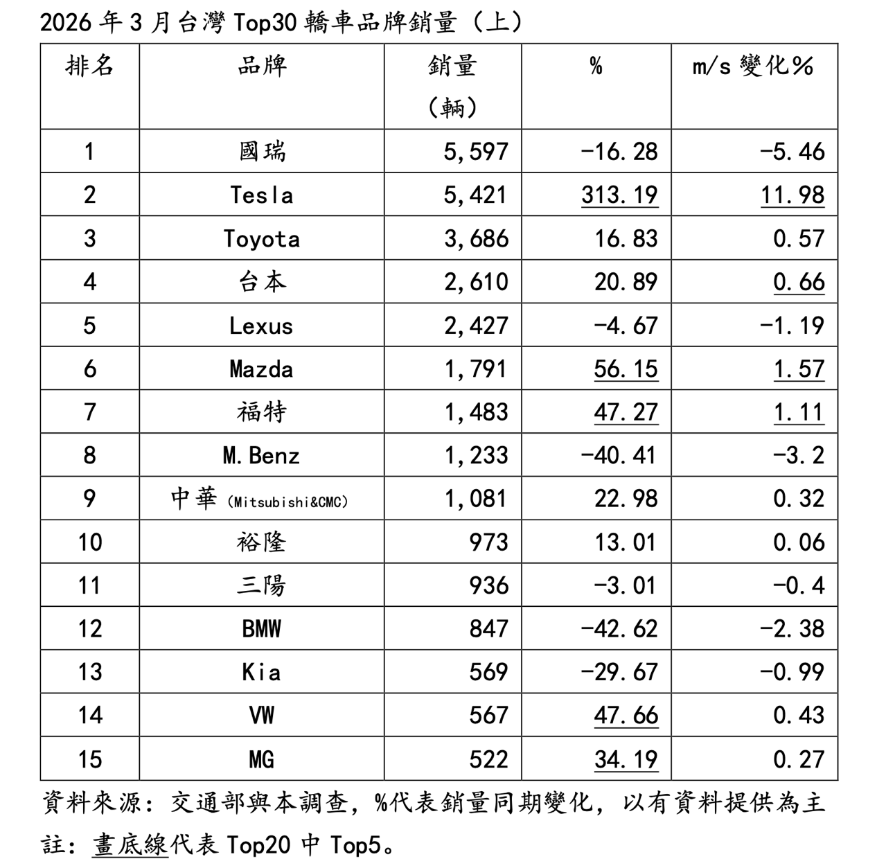 在品牌表現方面,2026年3月台灣Top20轎車品牌中,銷量市佔率同期擴張Top5依序為Tesla(+12%)、Mazda(+1.57%)、Foxtron(+1.23%)、福特(+1.11%)與台本(+0.66%);若以銷量同期成長來看,Top5則為Tesla(+3.13倍)、Mazda(+56.15%)、VW(+47.66%)、福特(+47.27%)與MG(+34.19%)。